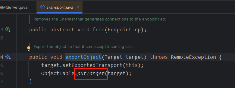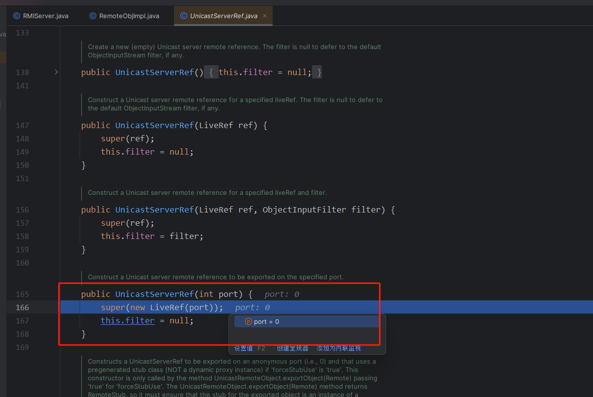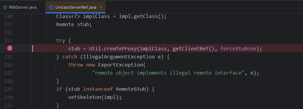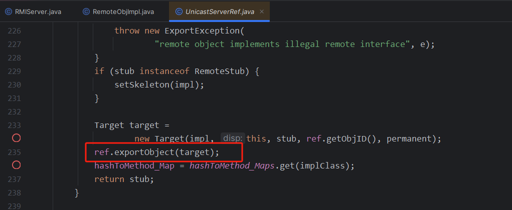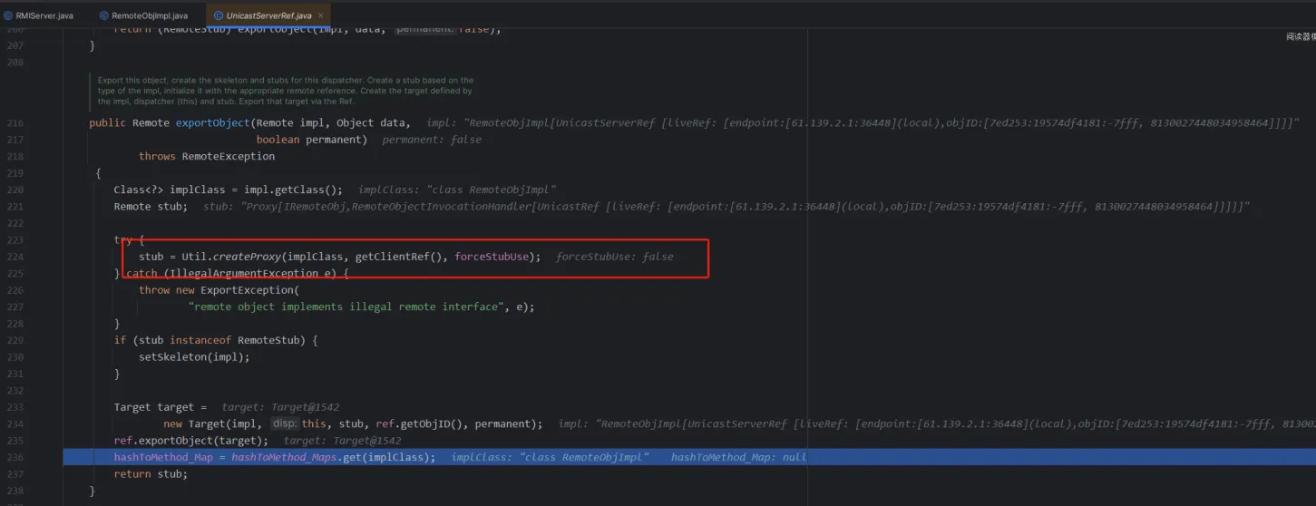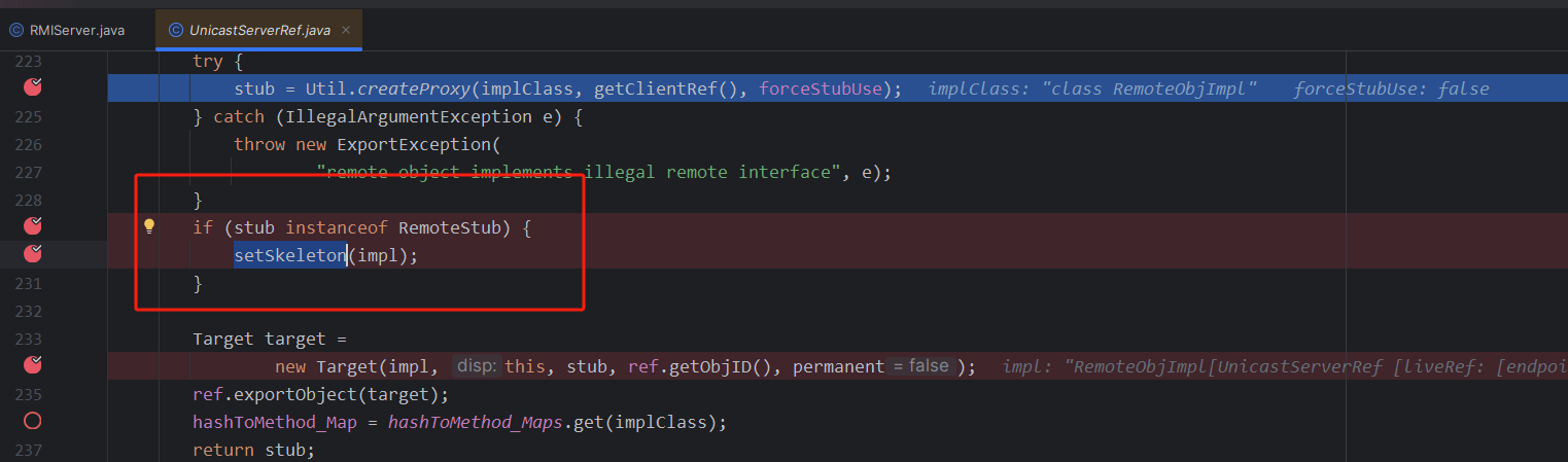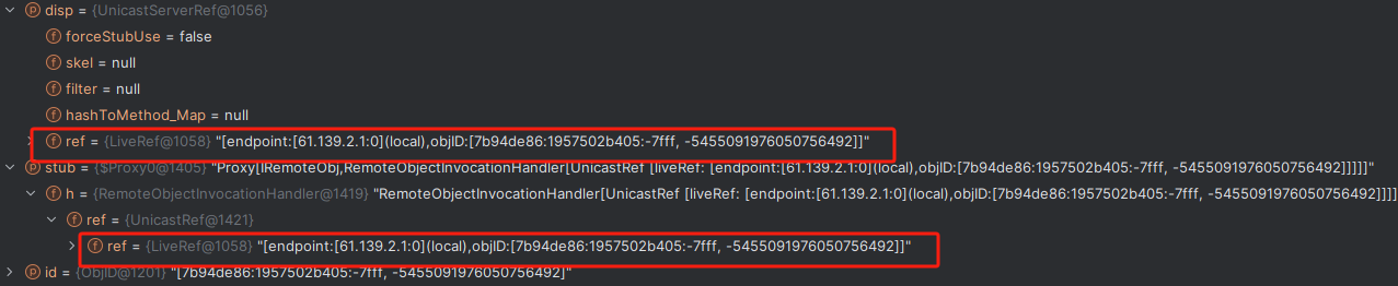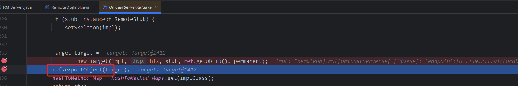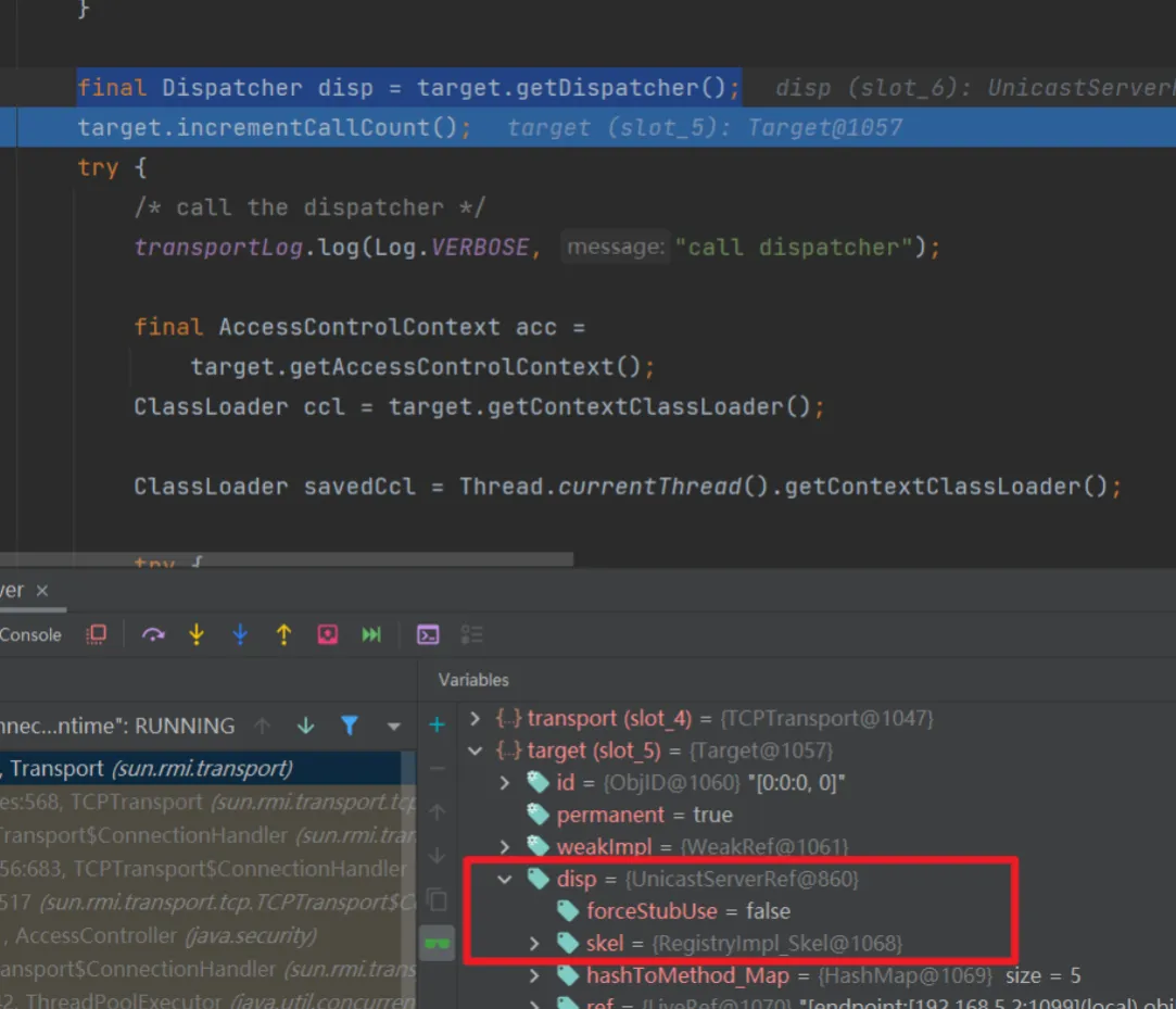 发现里面有一个stub,stub中是一个ref,对应的1099,然后过了if之后,走到了final Dispatcher disp = target.getDispatcher();,作用是将skel放到disp里面