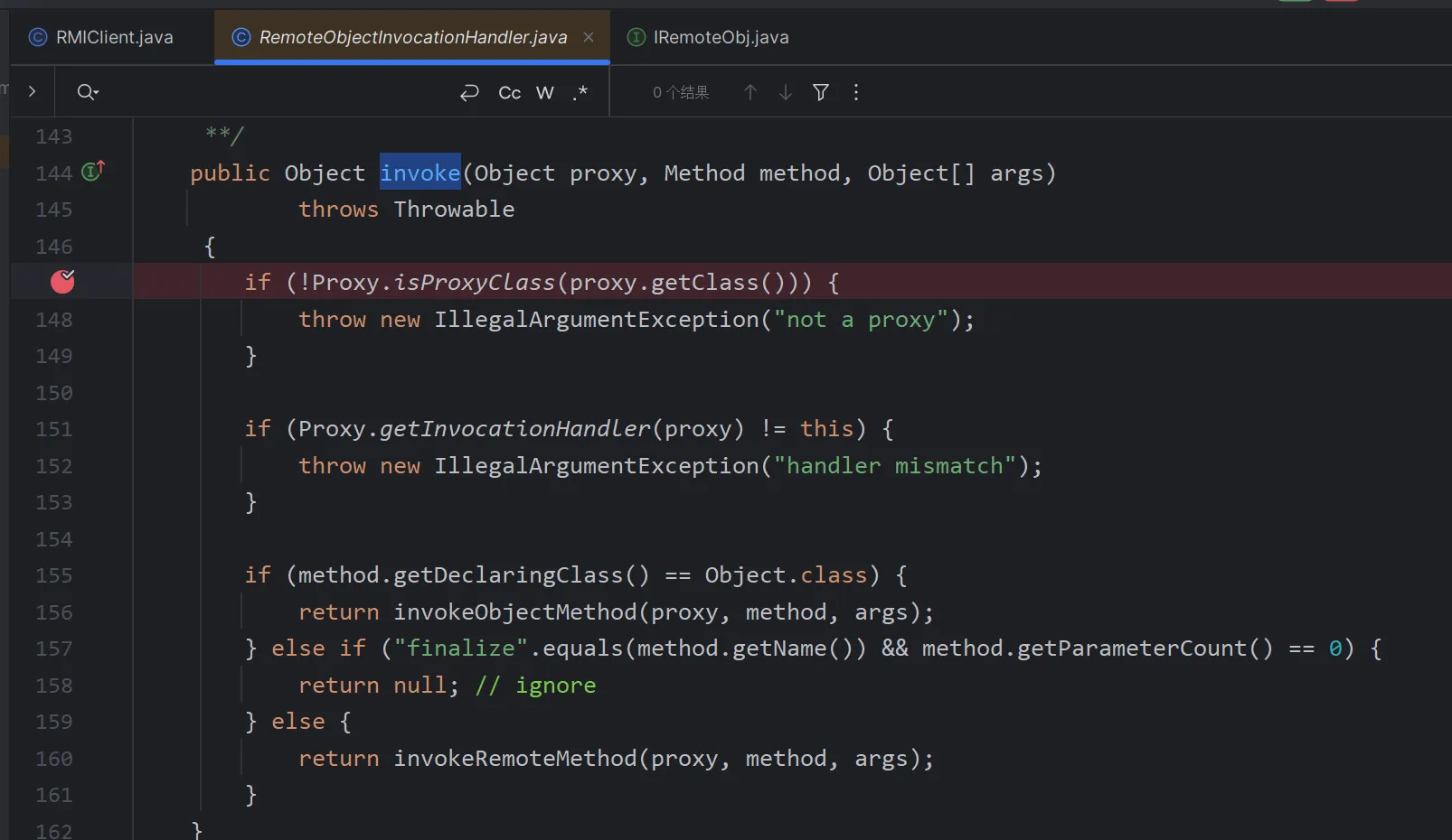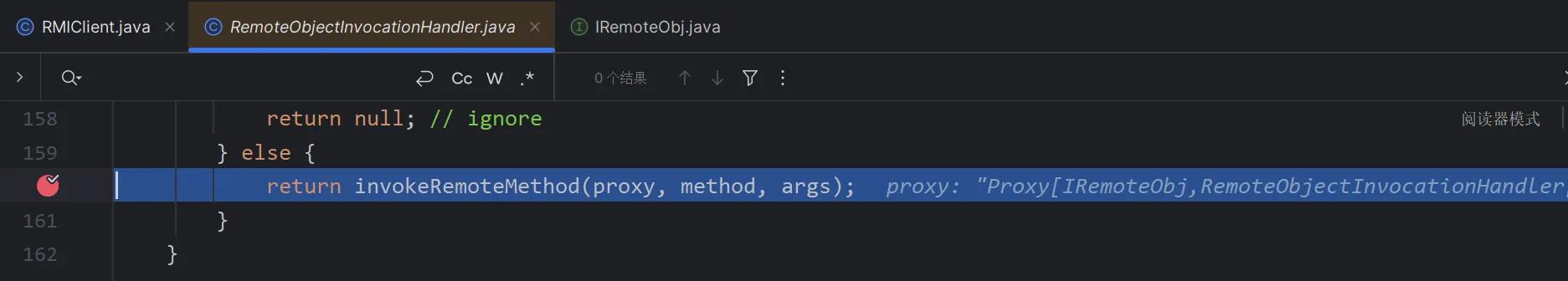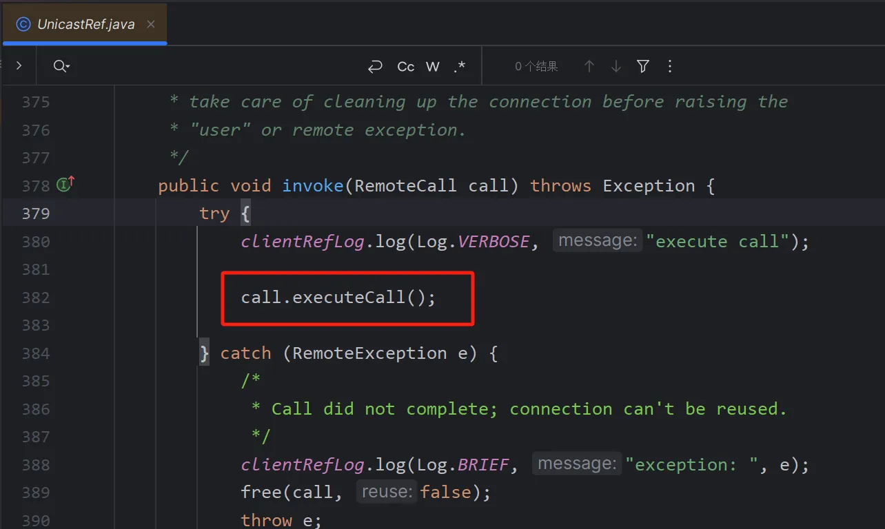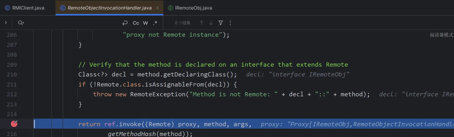 这里你直接跟是无法跟进去的,因为你这里获取到的远程对象是一个动态代理,而动态代理在cc分析的时候也知道当他调用任意一个方法的时候,就会调用invoke方法,我们这里直接到RemoteObjectInvocationHandler里面给invoke下一个断点
