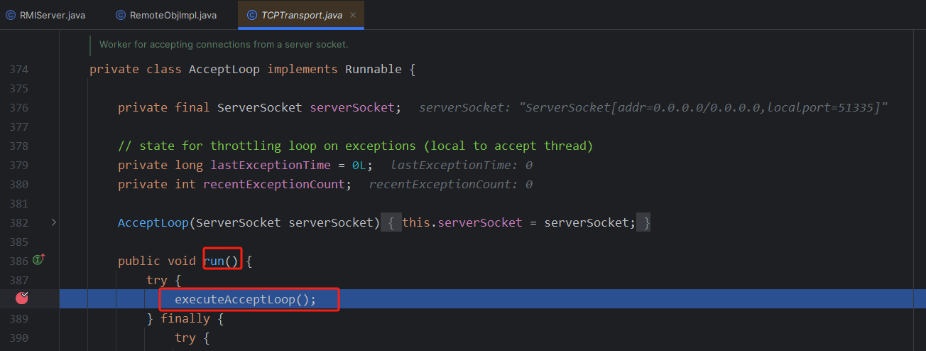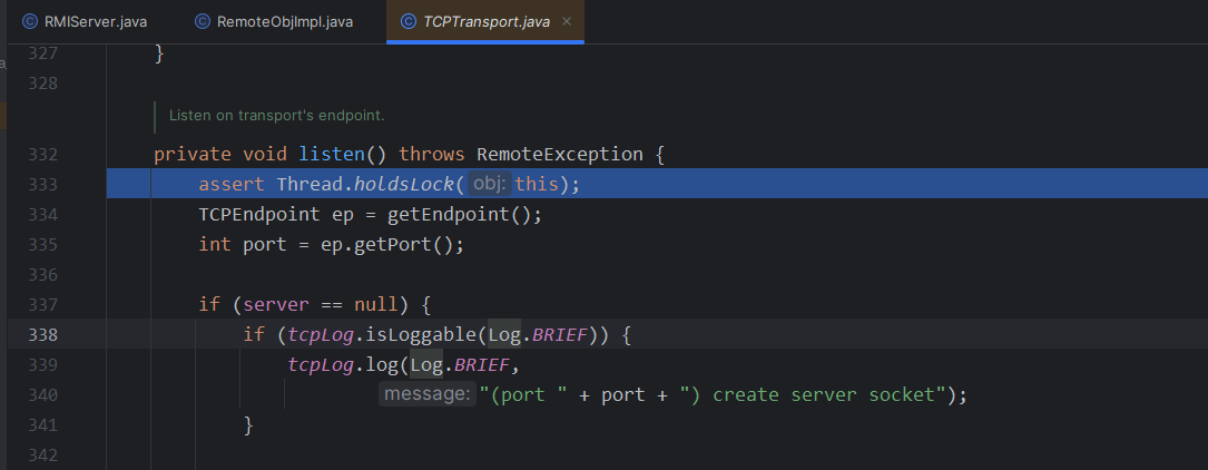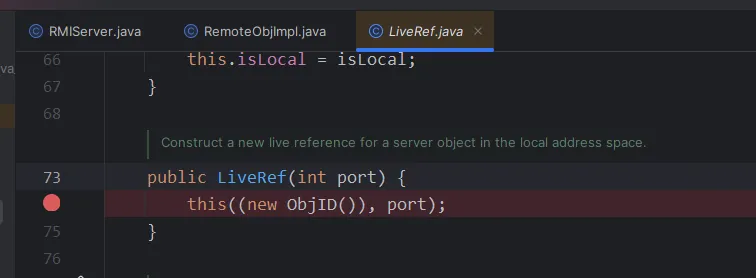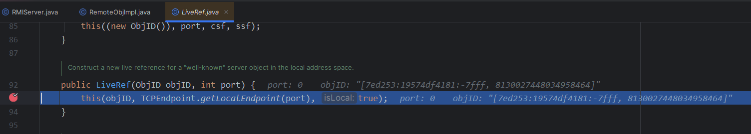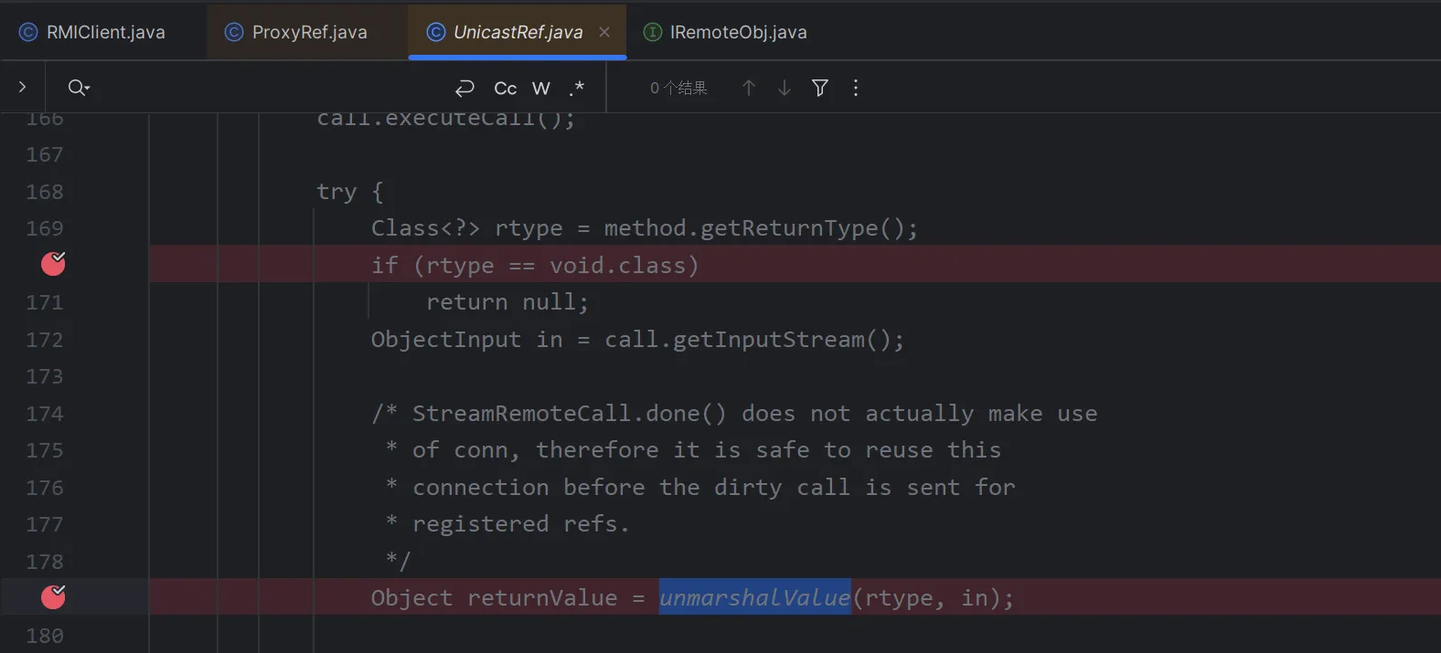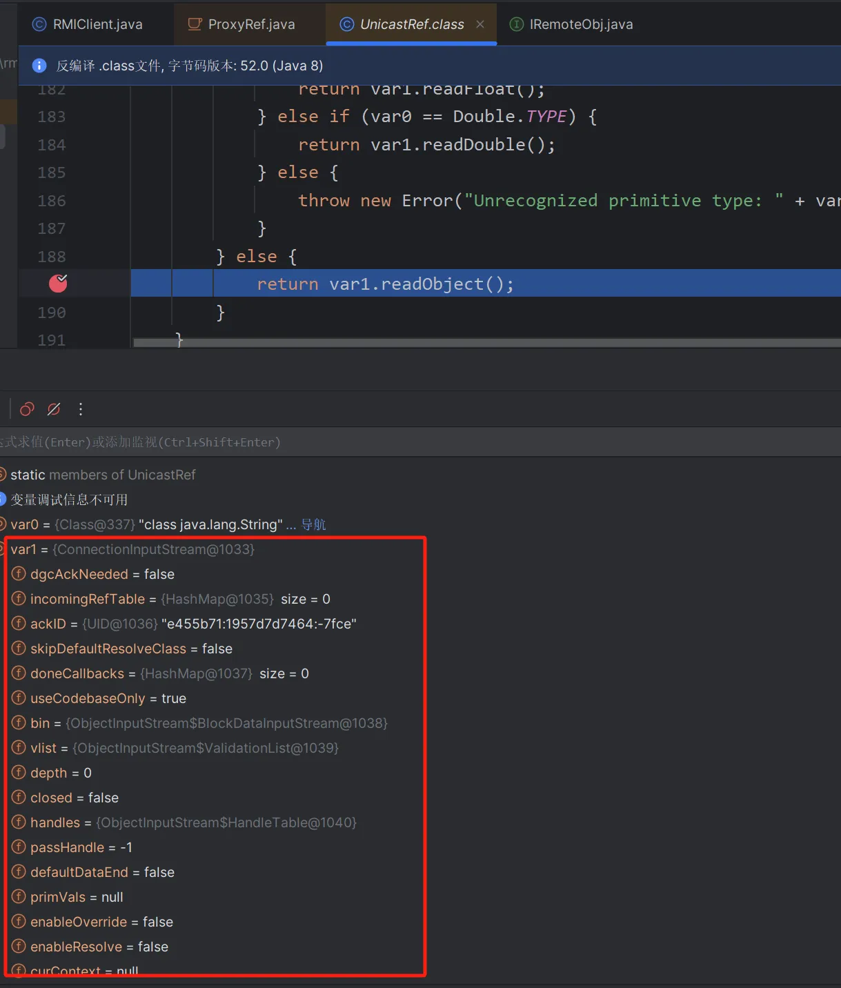 这里你直接跟是无法跟进去的,因为你这里获取到的远程对象是一个动态代理,而动态代理在cc分析的时候也知道当他调用任意一个方法的时候,就会调用invoke方法,我们这里直接到RemoteObjectInvocationHandler里面给invoke下一个断点