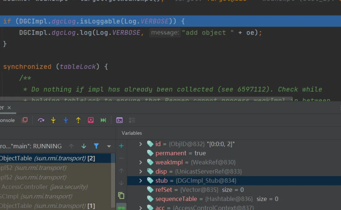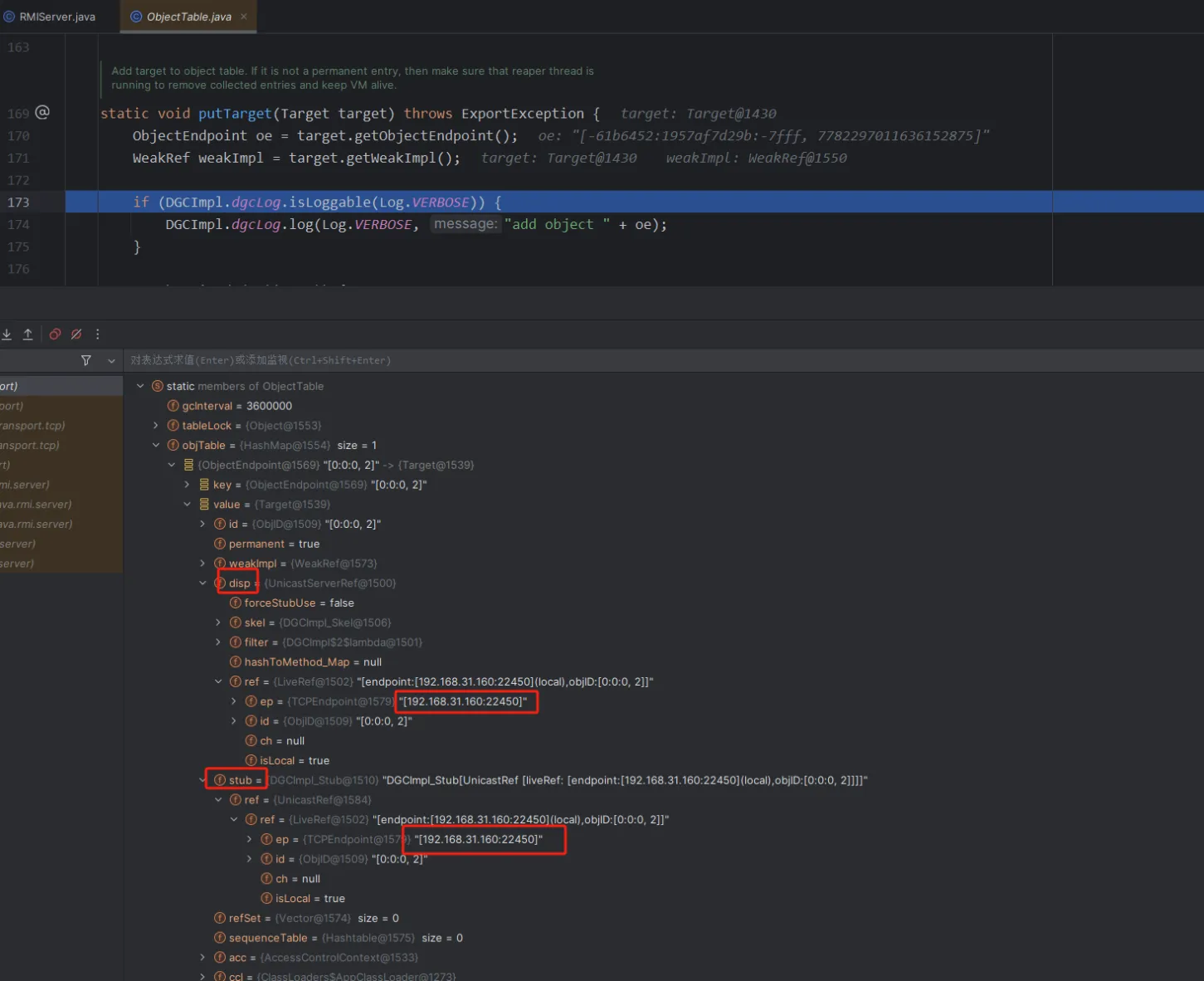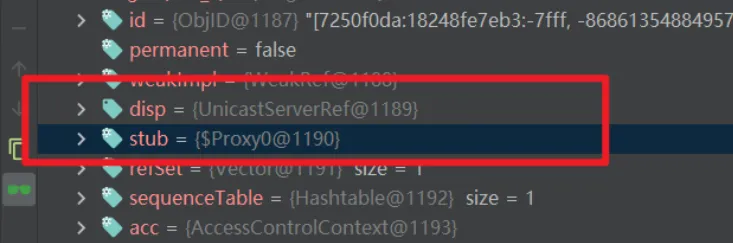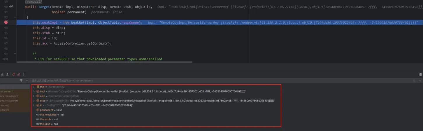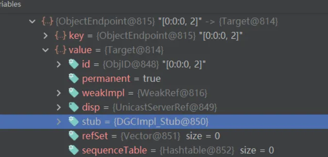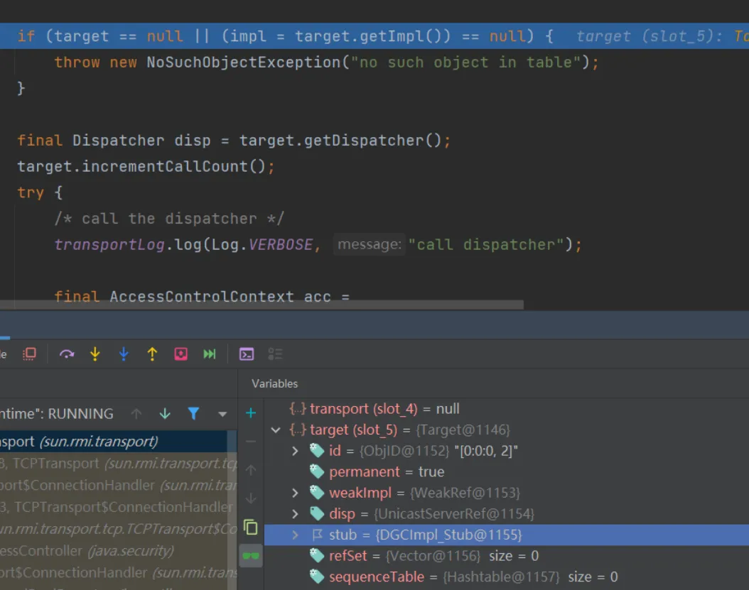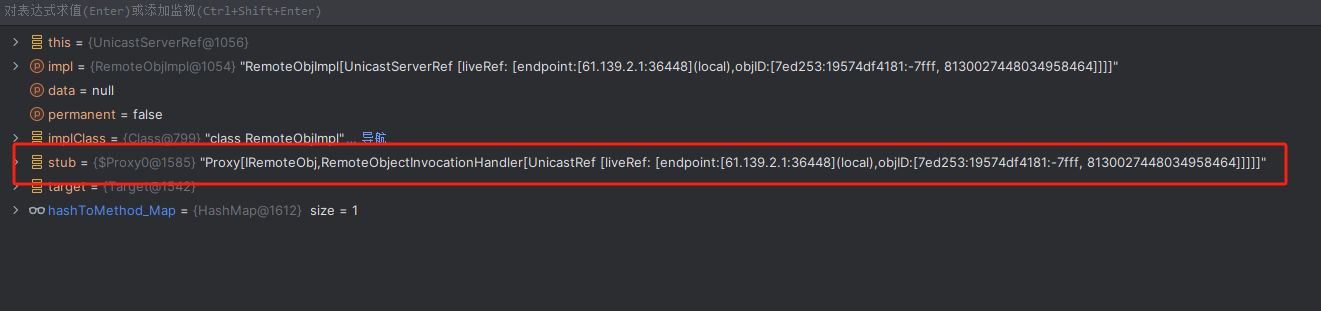 这里还有一个需要注意的就是打完这两个断点之后,得到的第一个target中的stub是DGCImpl,但这个是用来处理内存垃圾的,所以我们要按两下f9,直到看到proxy动态代理的stub为止