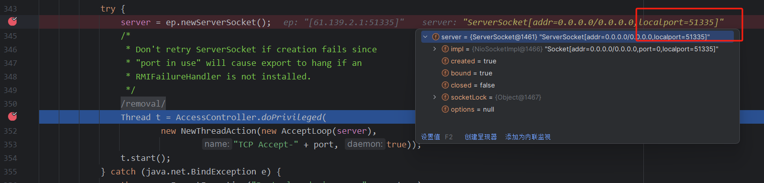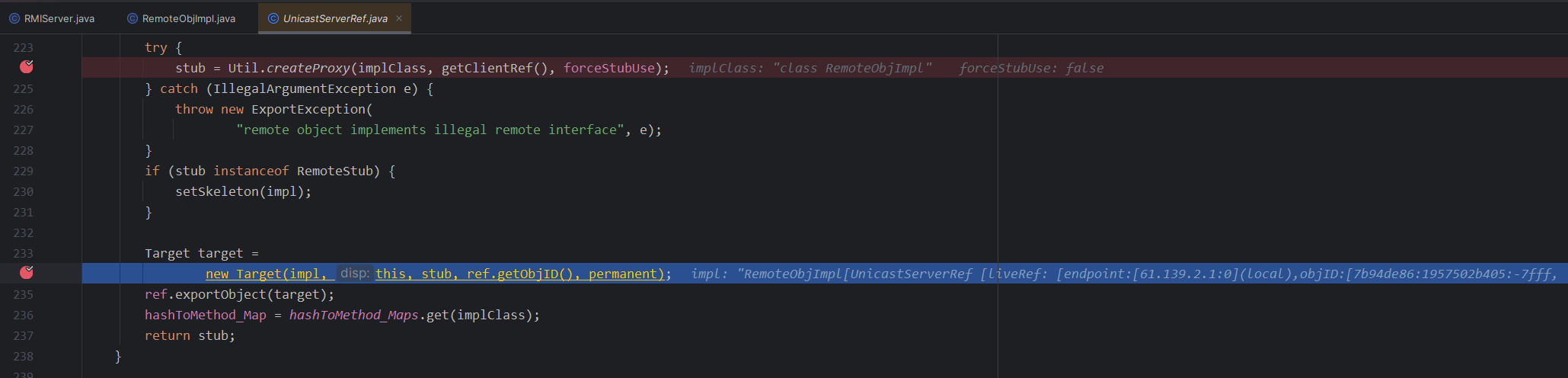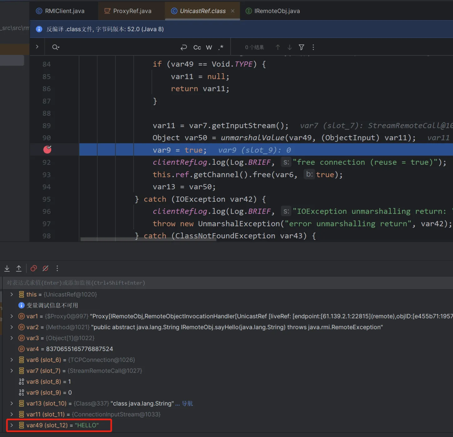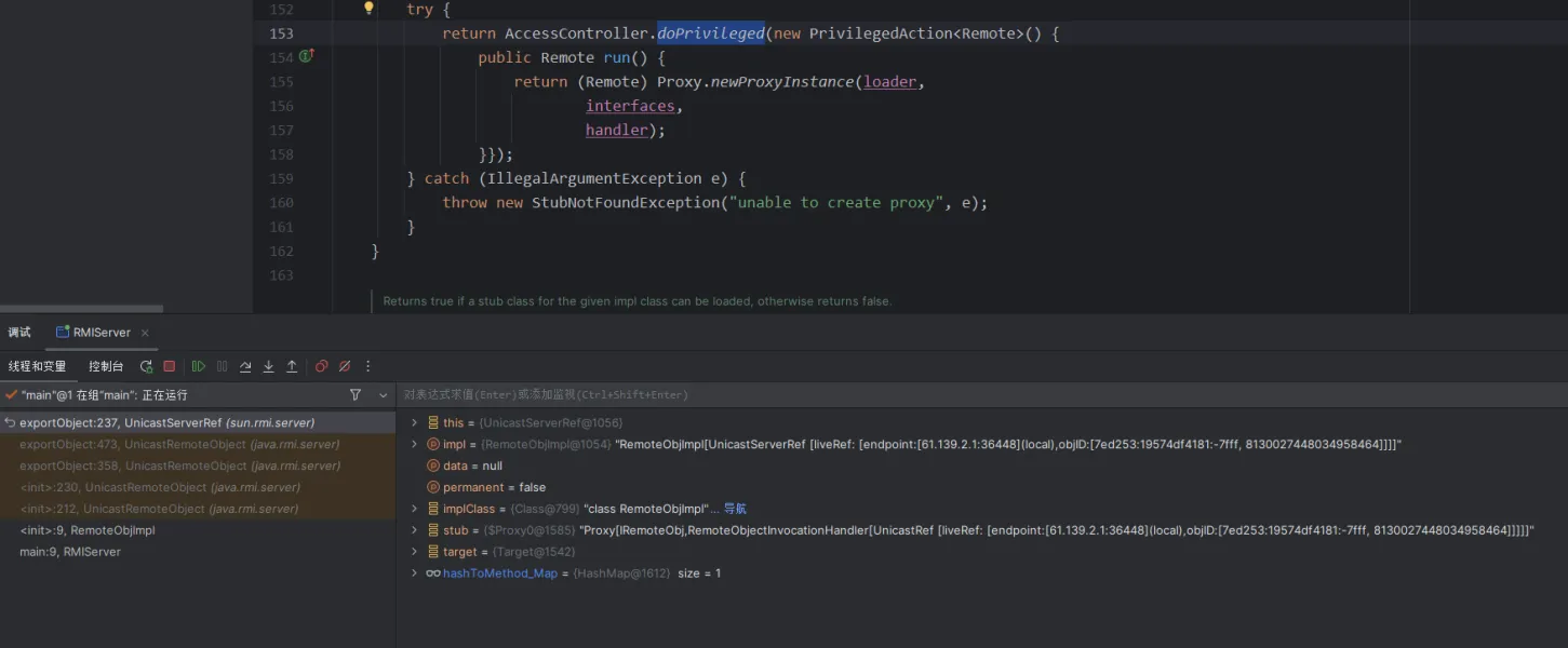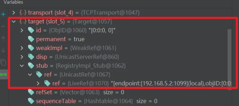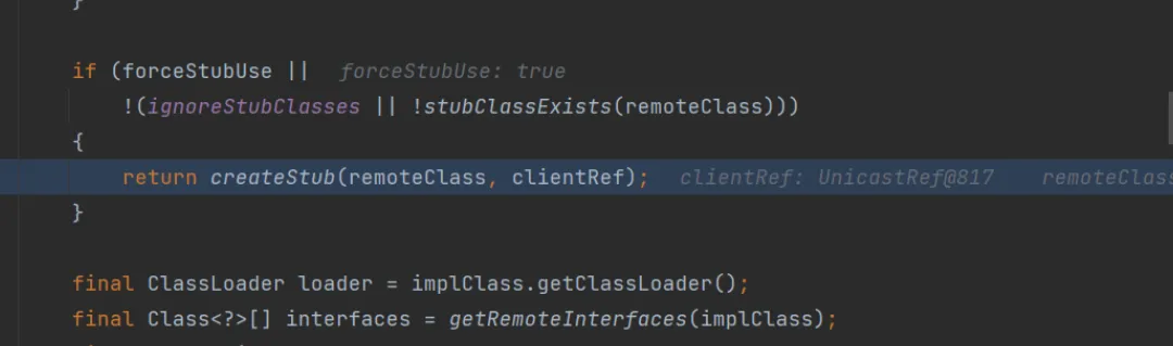 这里还有一个需要注意的就是打完这两个断点之后,得到的第一个target中的stub是DGCImpl,但这个是用来处理内存垃圾的,所以我们要按两下f9,直到看到proxy动态代理的stub为止
