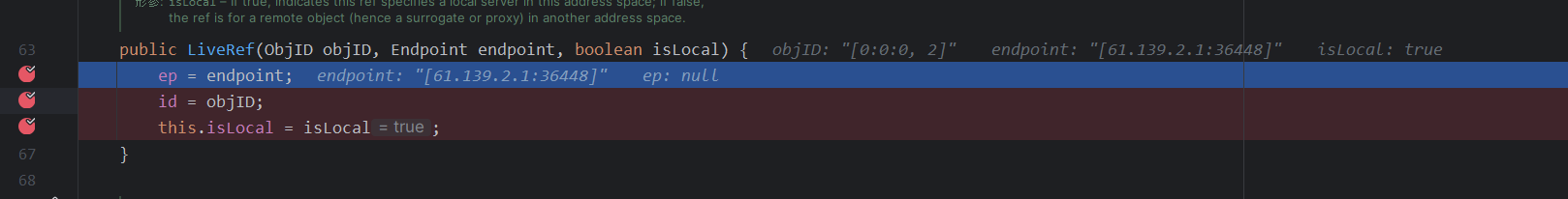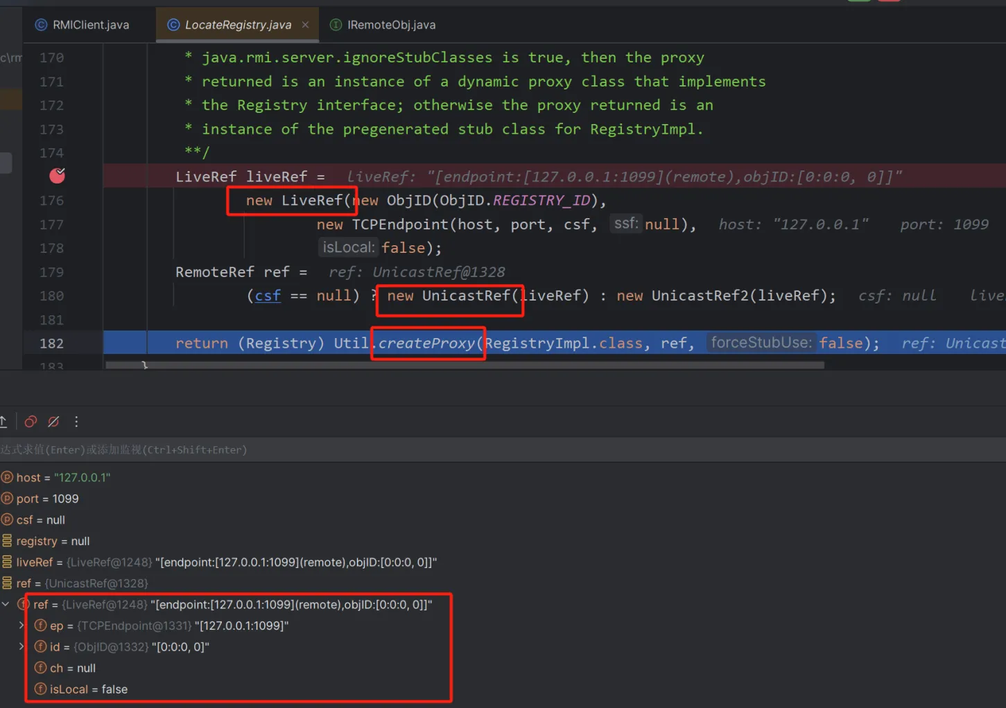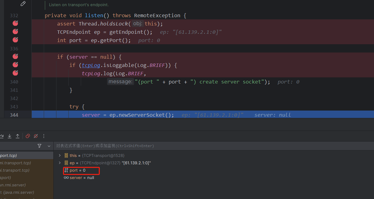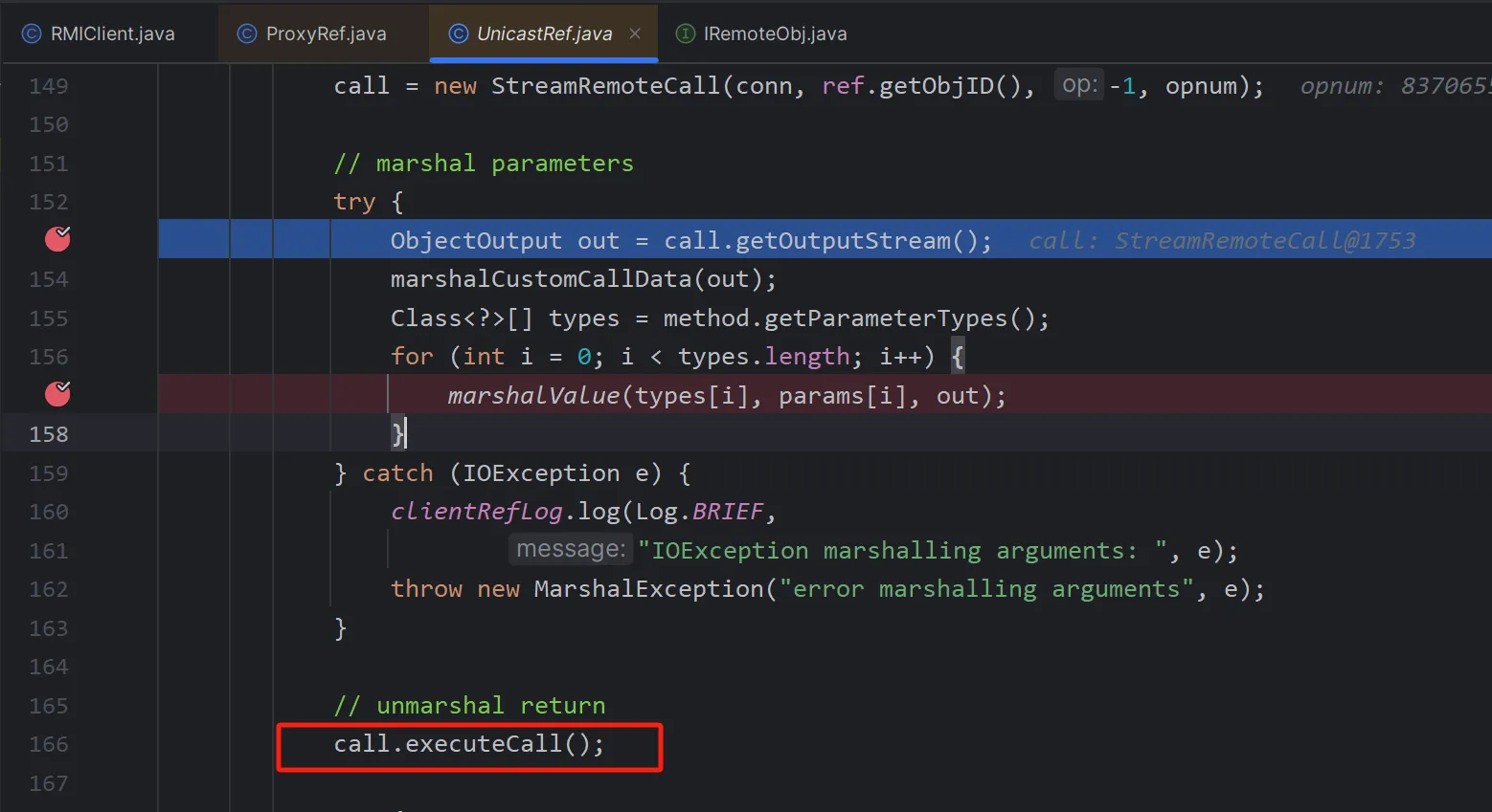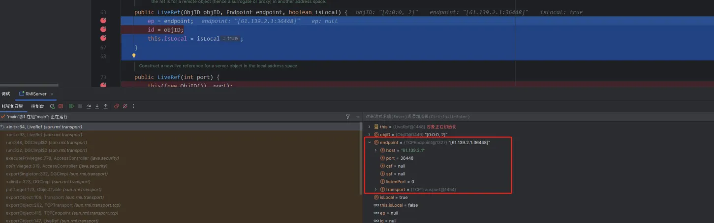 这里还有一个需要注意的就是打完这两个断点之后,得到的第一个target中的stub是DGCImpl,但这个是用来处理内存垃圾的,所以我们要按两下f9,直到看到proxy动态代理的stub为止