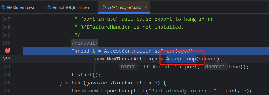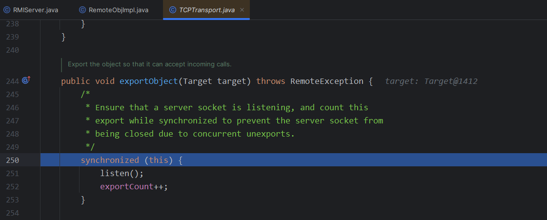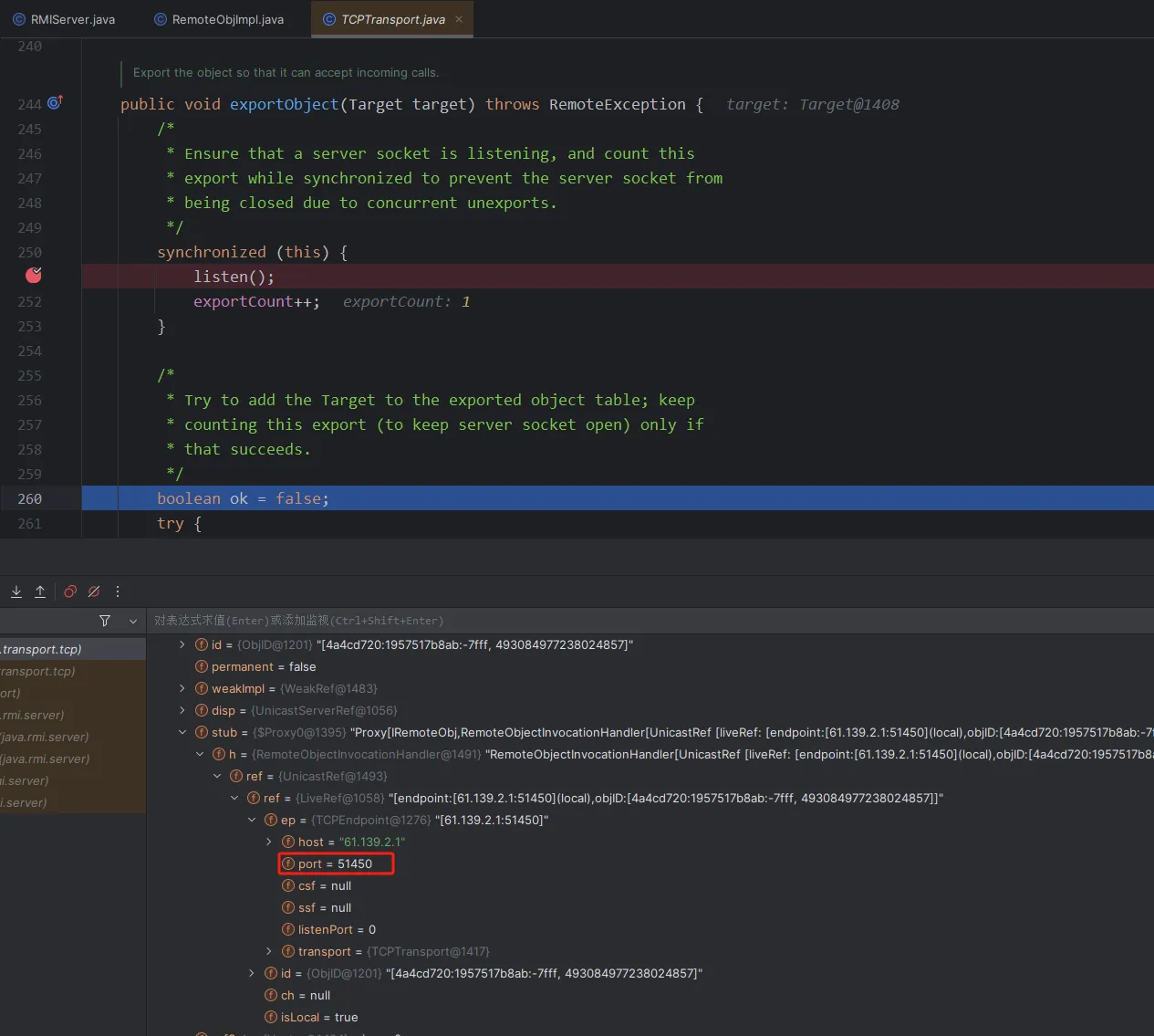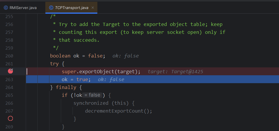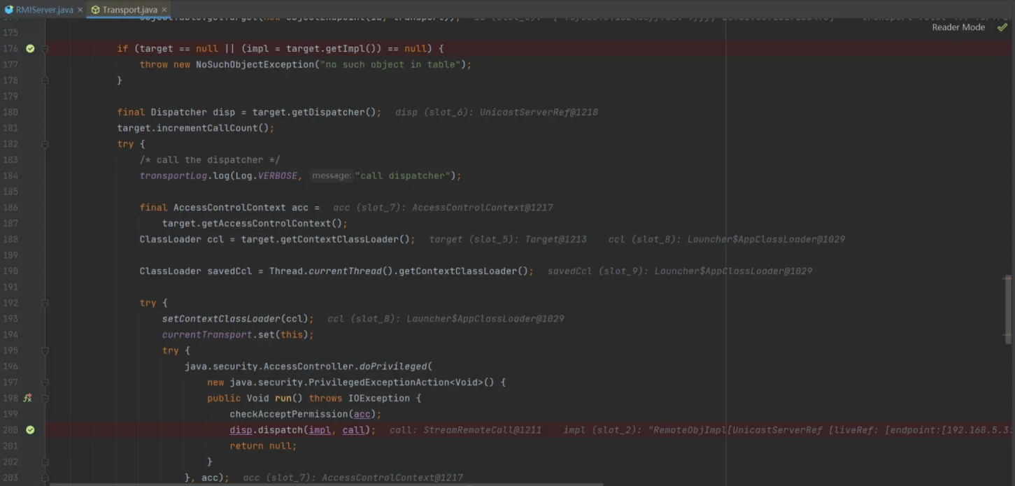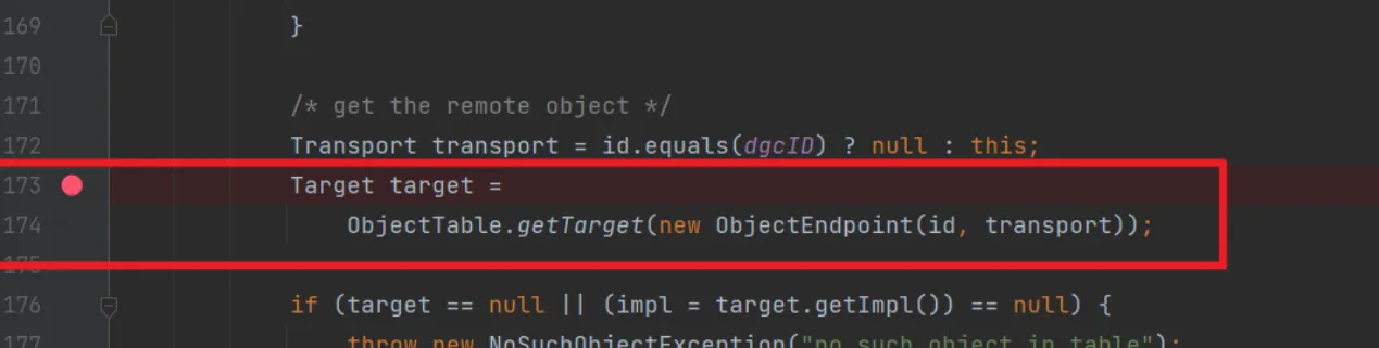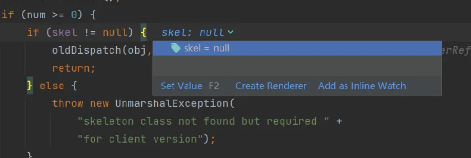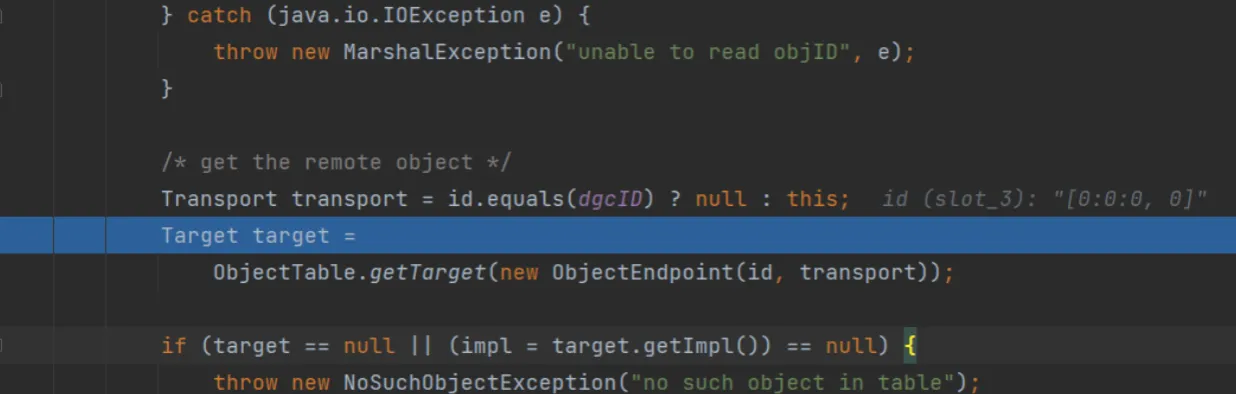 因为在客户端那里,我们操作的是一个stub,而服务端操作的是一个skel,而在之前的分析里我们知道skel会被存在target里面,所以断点下到服务端代码里的处理target的地方