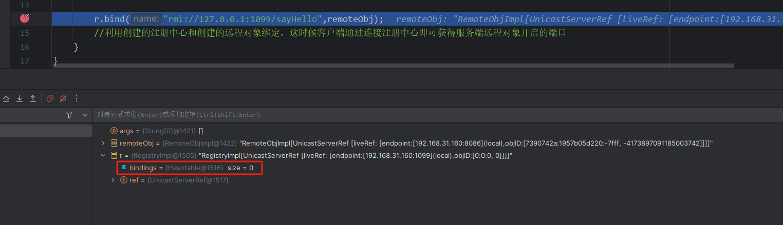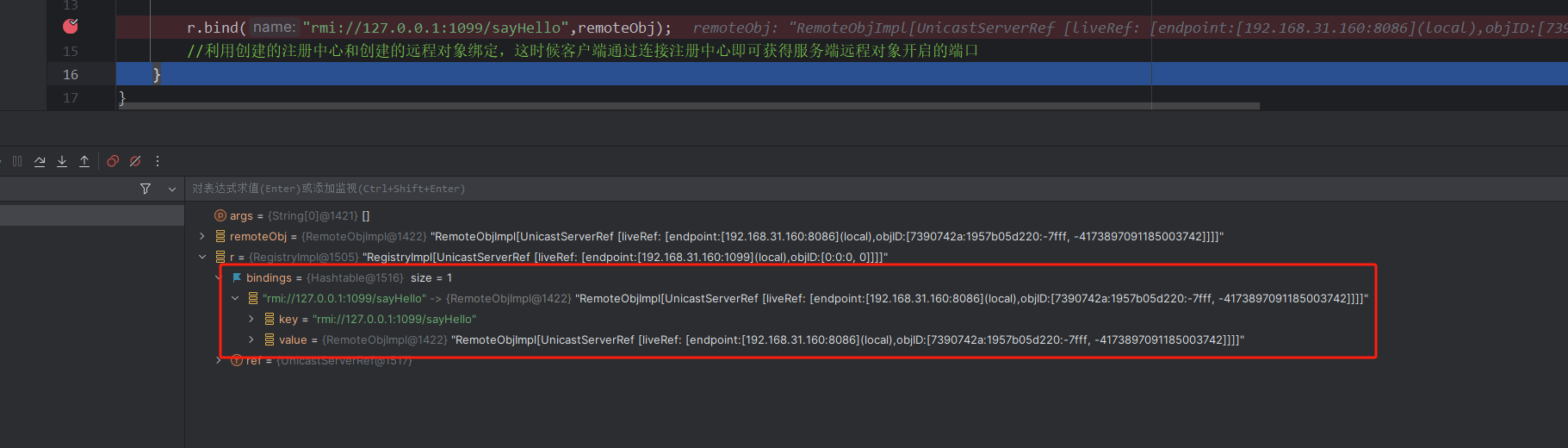 //利用创建的注册中心和创建的远程对象绑定,这时候客户端通过连接注册中心即可获得服务端远程对象开启的端口