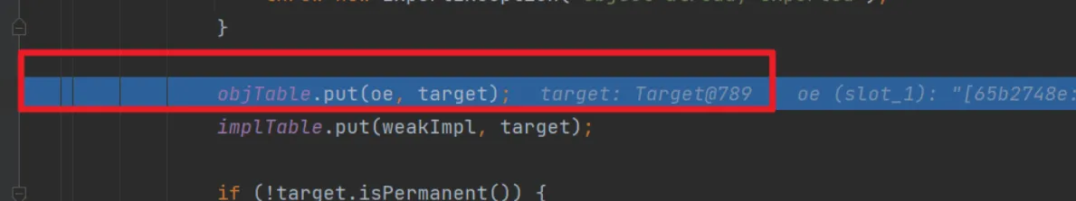 断点需要下在ObjectTable 类的 putTarget() 方法里面(要把之前那两个去掉)然后运行到光标处f9