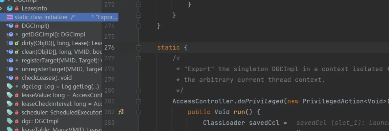 类的初始化是由 DGCImpl 这个类完成的,所以我们到里面看看,看到一个作用于class initializer的static方法