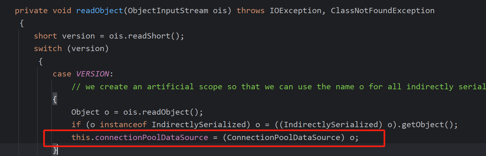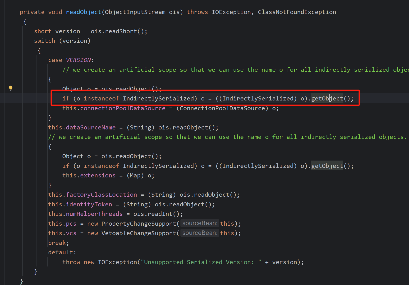 PoolBackedDataSourceBase.readObject想要进到getObject中必须要满足传入的类是IndirectlySerialized 这个类