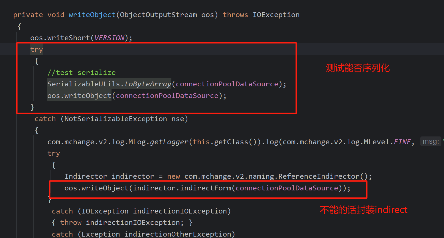那这里就没办法了,所以我们去看一下PoolBackedDataSourceBase的writeObject(也就是序列化),发现他在检测到无法反序列化的时候,会用indirector封装一层