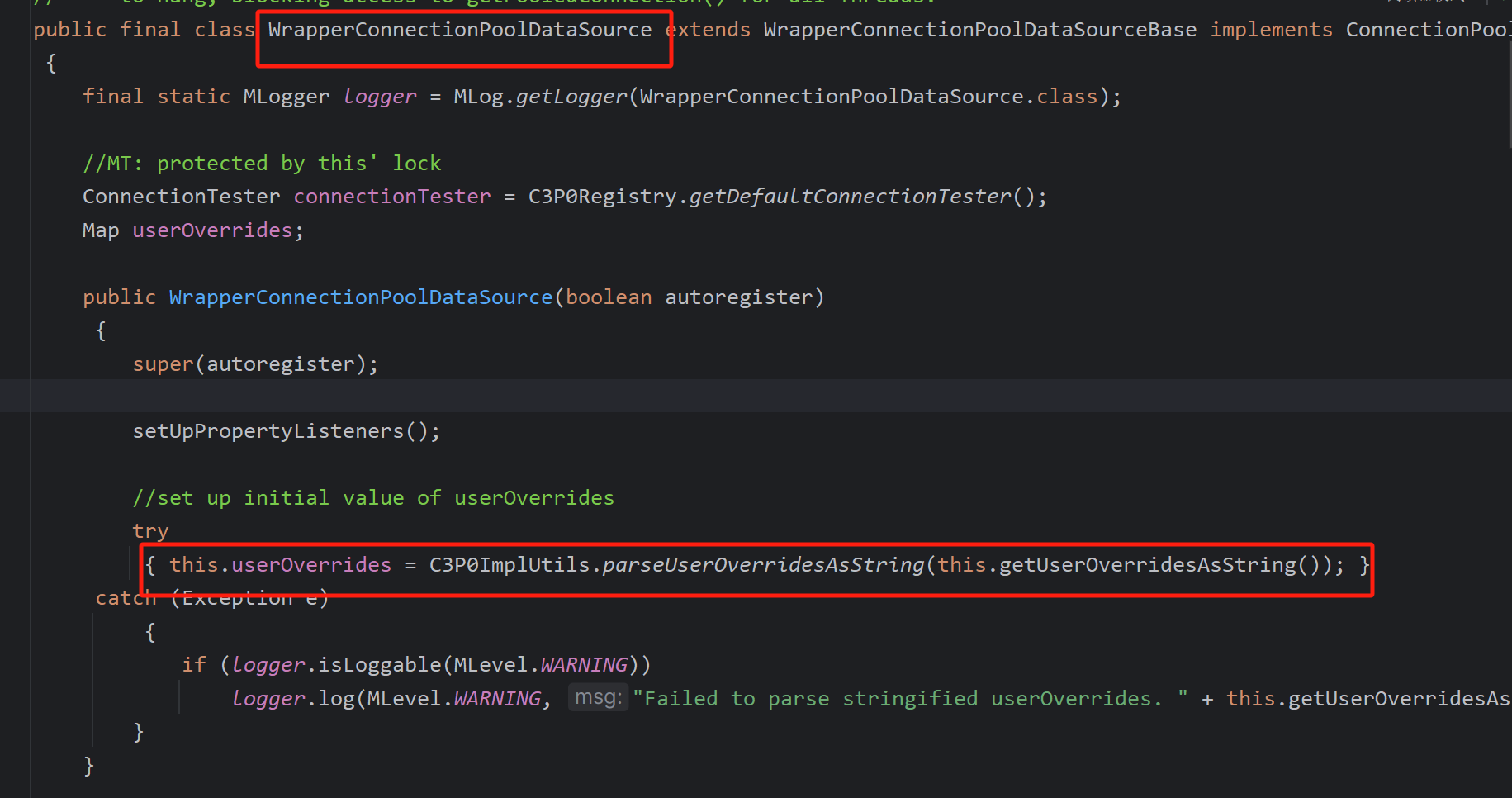 看构造函数发现在给userOverrides赋值的时候会调用C3P0ImplUtils.parseUserOverridesAsString()方法