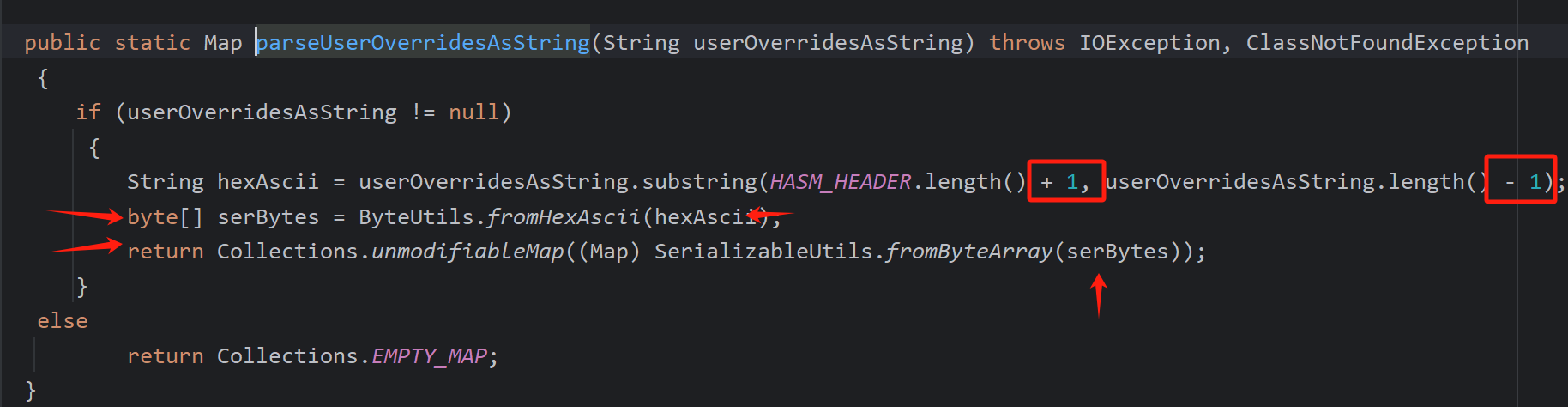 跟进去看看发现,他将hex字符串读进来之后,首先把把字符串头部的HASM_HEADER截掉了,以及会截掉字符串最后一位