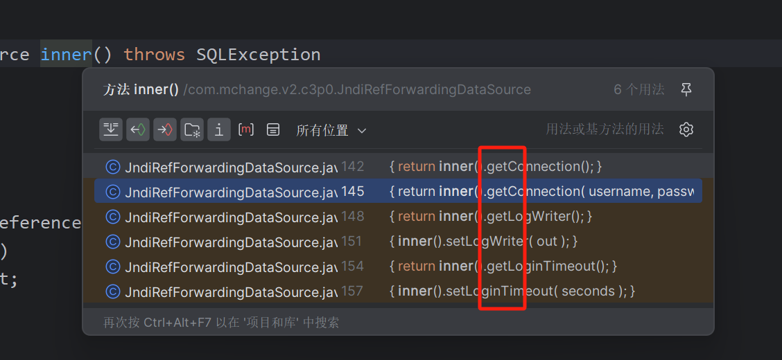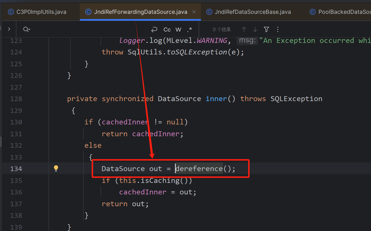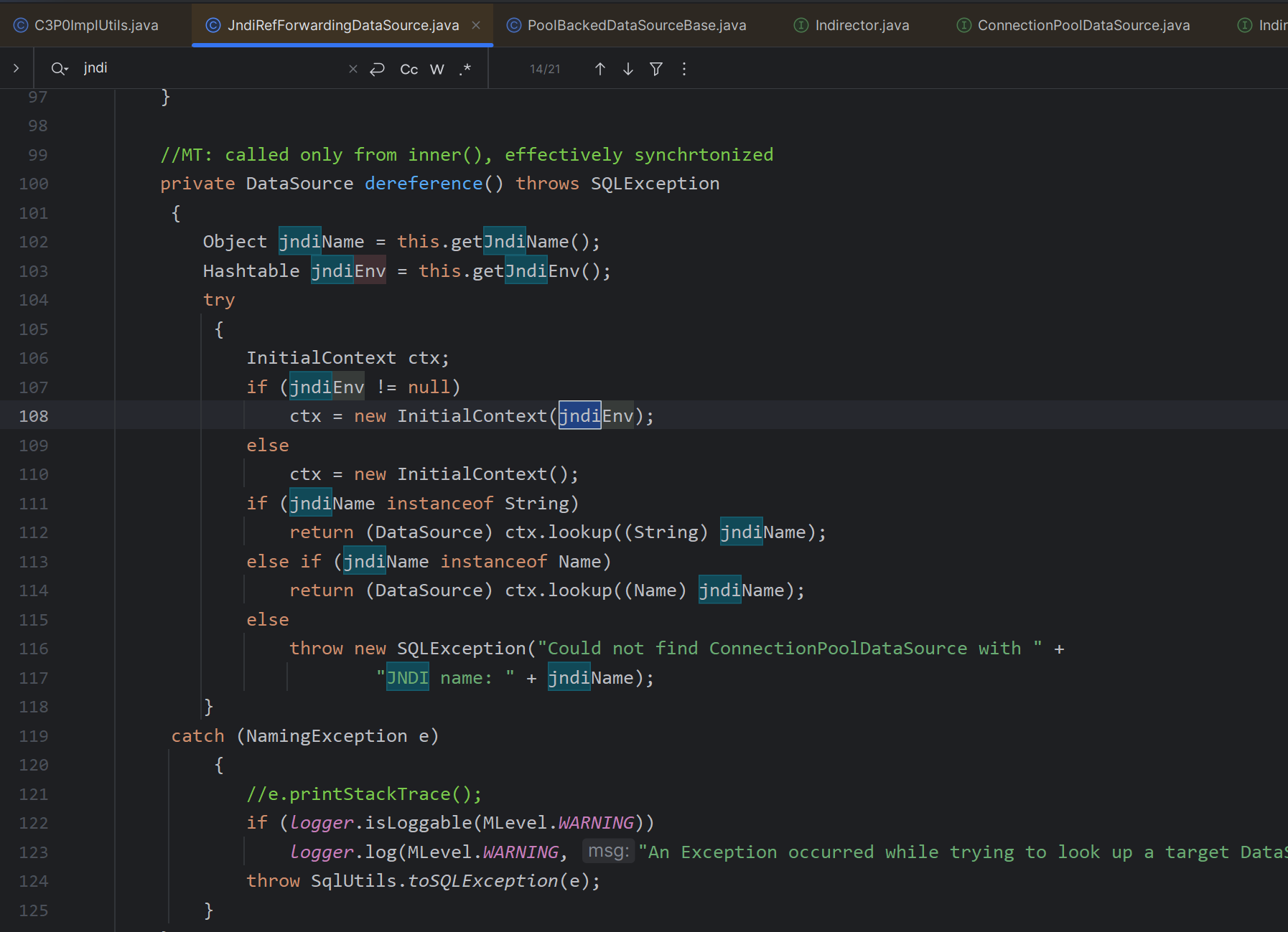 这里我们可以从漏洞发现者的思维去寻找,先全局搜一下jndi,点开第一个类JndiRefForwardingDataSource中的dereference方法