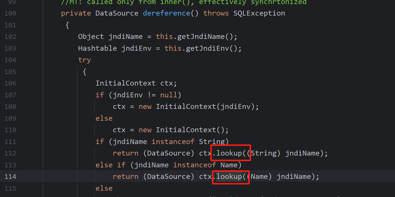 然后全局搜一下lookup,在112行和114行发现了一个lookup且参数名是jndiname,那肯定要去看一看这个jndiname能不能想办法控制