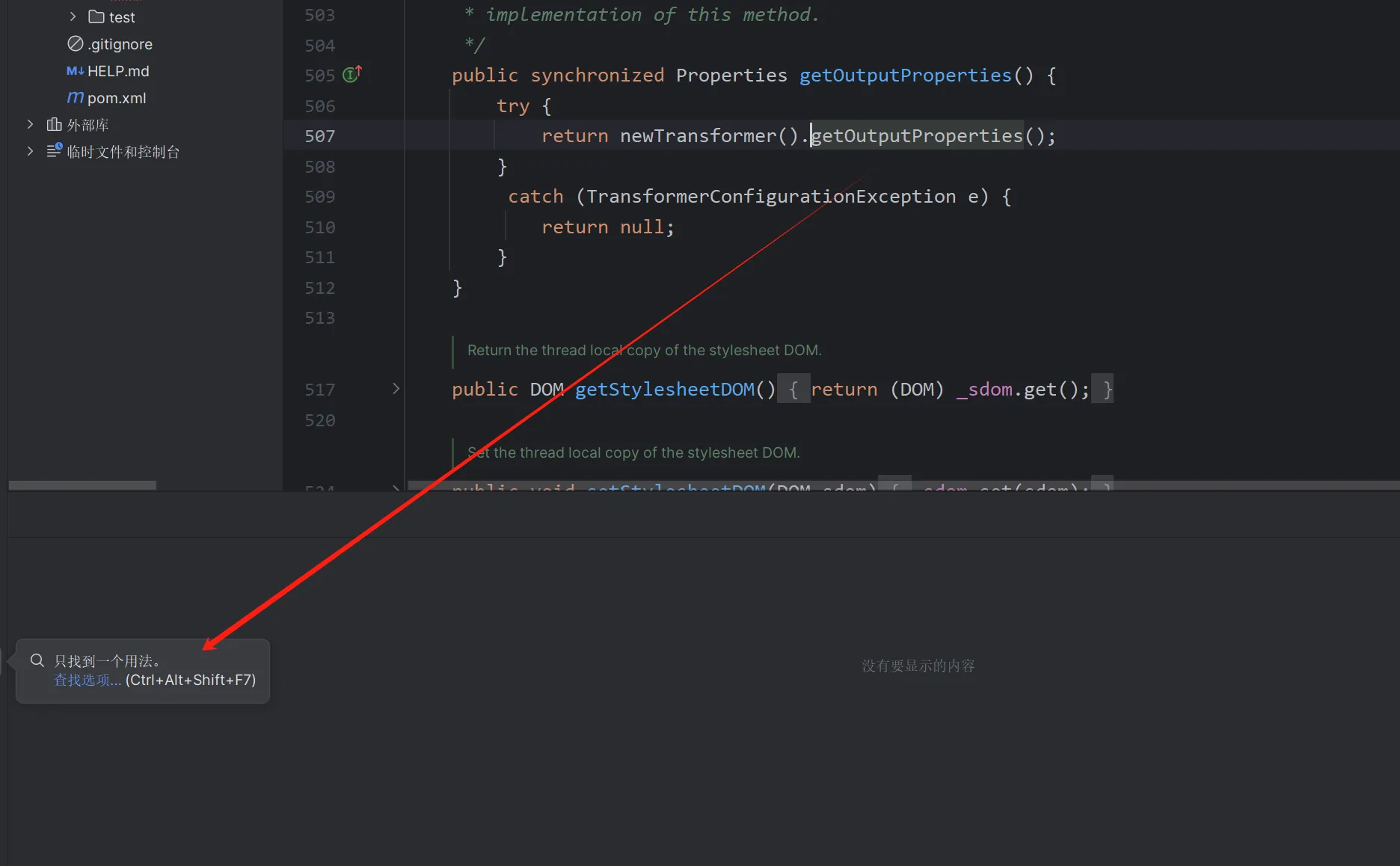 这里看其他师傅的链尾是TemplatesImpl.getOutputProperties(),很熟悉,在cc里面见过,这里我们按照常规思路应该是去找find usages,但是发现找不到