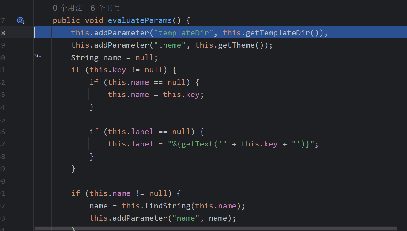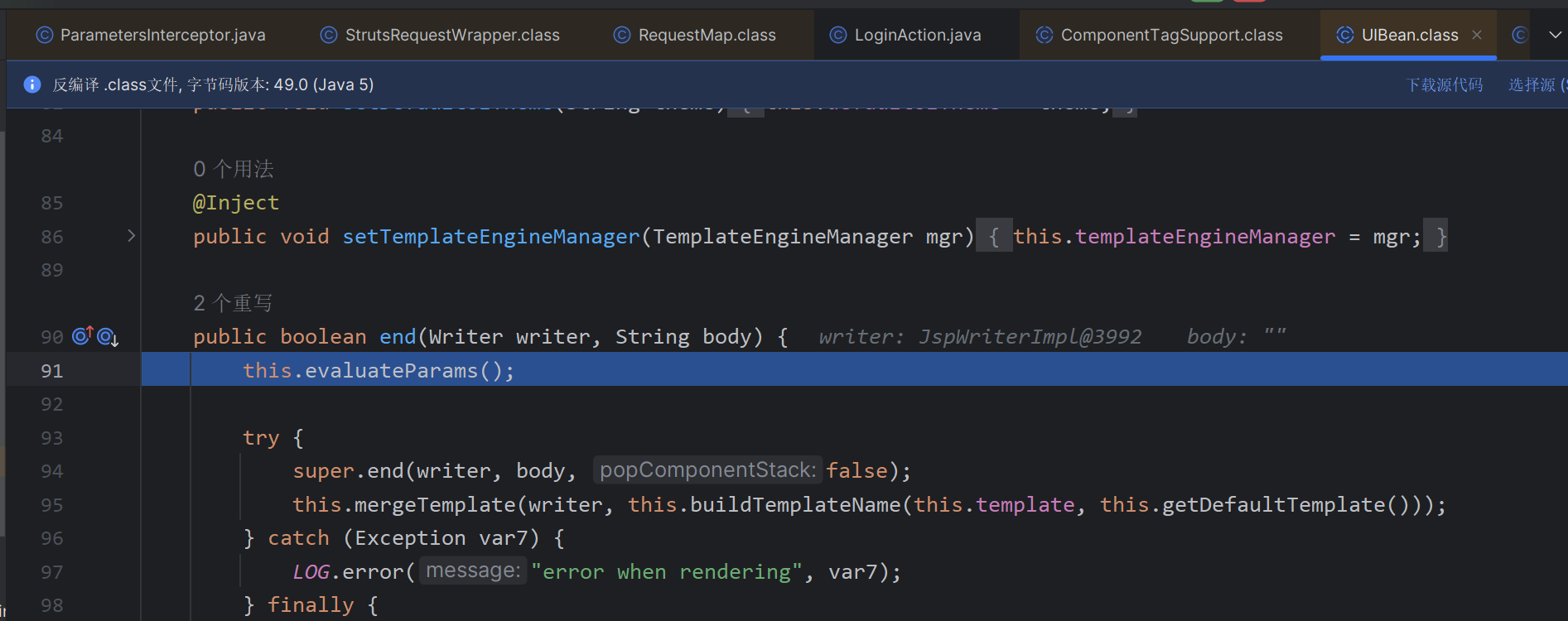 而在doendtag方法中的end方法就是我们今天的主角,也就是漏洞触发的地方,我们跟进去,在跟进evaluateParams() 方法中去