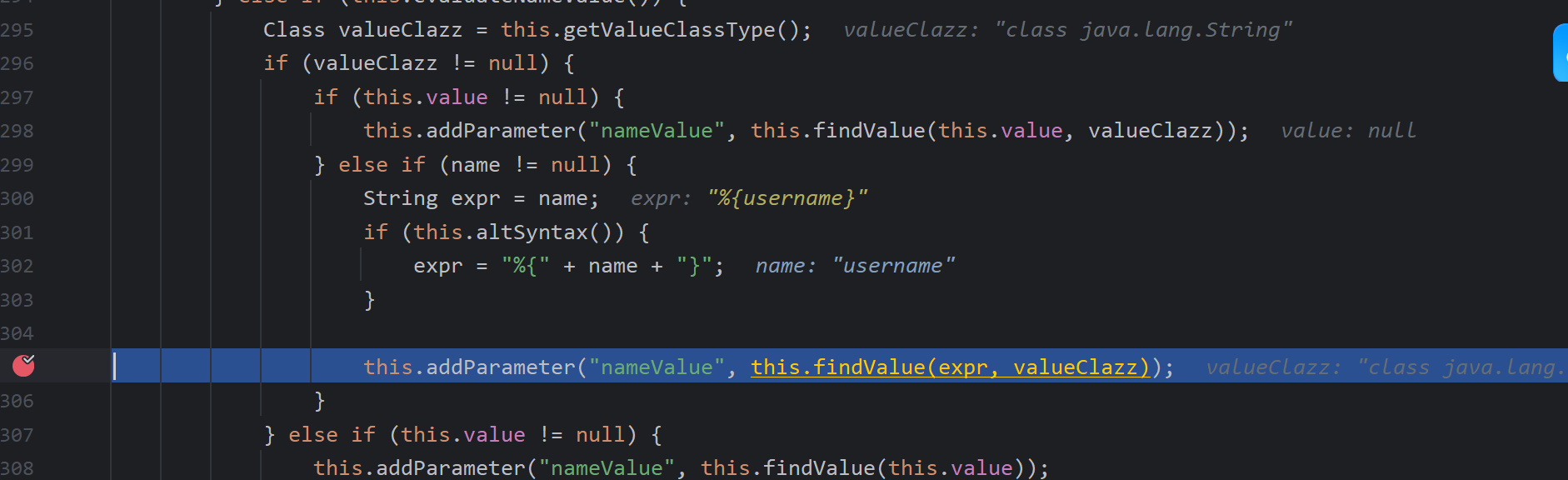 然后在这个方法中往下找到altSyntax参数(大概在305行左右,根据个人情况而定),这里由于altSyntax是默认开启的,所以代码会跳到addParameter处执行findvalue方法寻找参数值