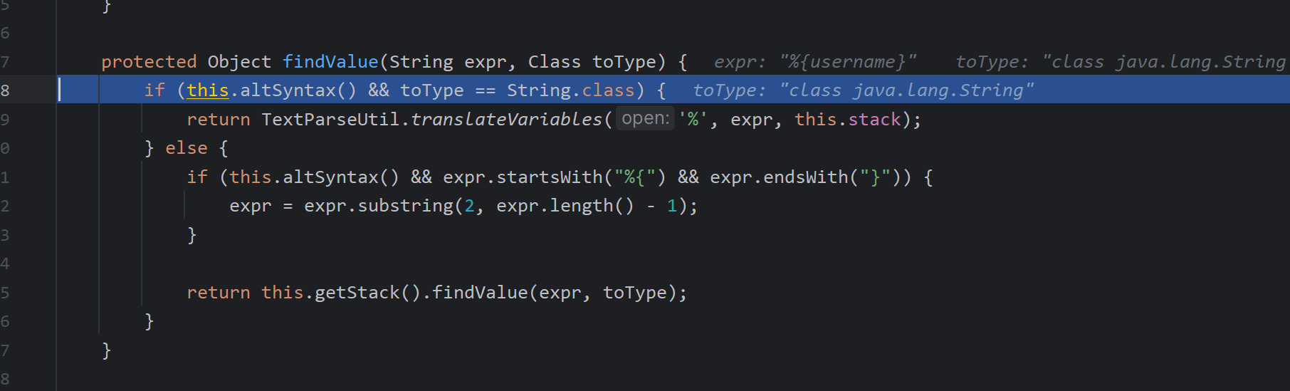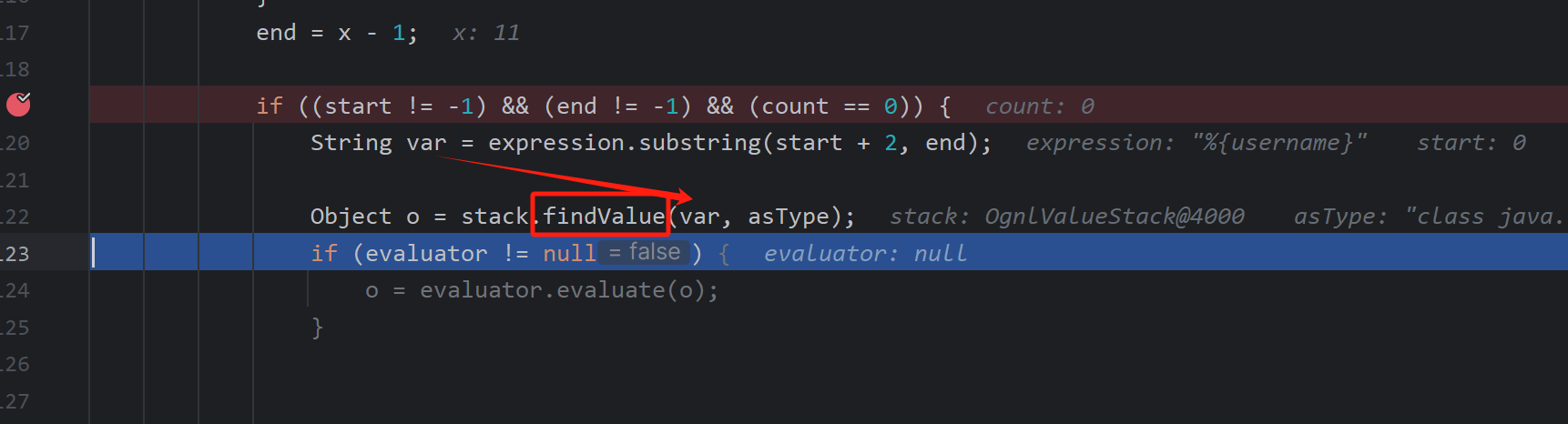 我们往下面看,会发现此处会将expr参数首尾的{和}去掉赋值给var参数,然后紧接着就是findvalue将获取到的username参数(也就是我们上方的%{2*2})赋值给o,然后会再次赋值给expression,这时检测到还是ognl表达式,就会再一次进入循环,这时候的结果就是4,并再次赋值o->expression,这时候检测到不是ognl表达式就不会进入循环,最终造成了s2-001漏洞
