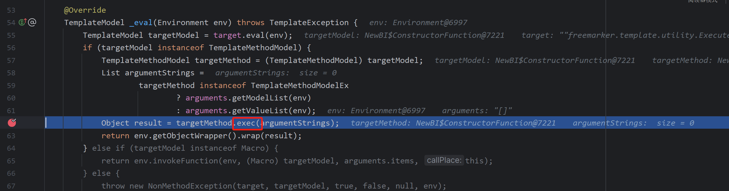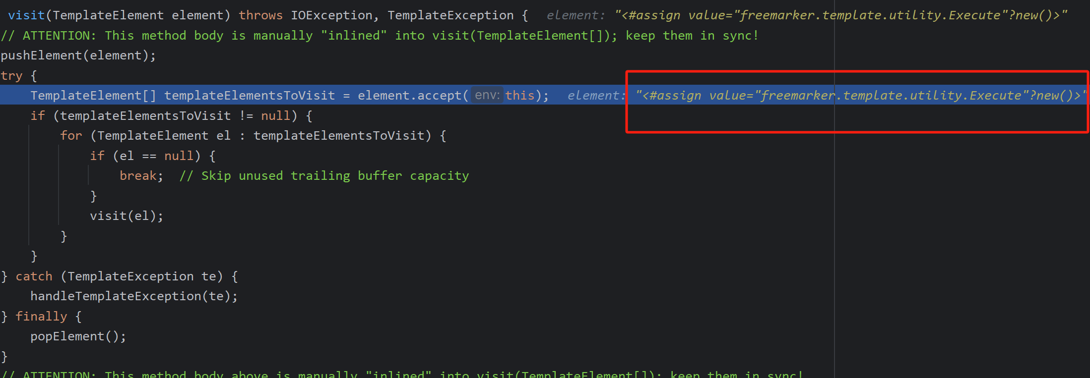 在这里他会一直去遍历你ftl文件中的内容,所以你最初调试跟进去的accept函数是还没有到ftl语句的普通HTML语言,他就不会去调用我所展示的那一串代码,所以你需要多点几次,直到看到element的内容变成了ftl语言,这时候跟进accept就是想要的结果了