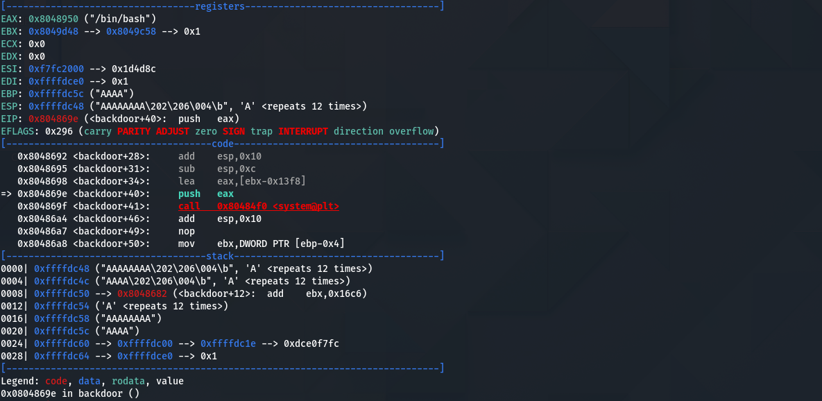 这里思路就已经很明确了,就是得跟踪到backdoor函数,利用主函数中的缓冲区溢出漏洞(vuln 函数), 将backdoor函数起始内存地址写入到EIP寄存器里,程序正常执行时,EIP寄存器就会读取backdoor的内存地址,执行backdoor函数,进而逐步执行到里面的system函数,从而获知里面具体执行的是什么系统指令,根据此指令是否对提权利用有所帮助;