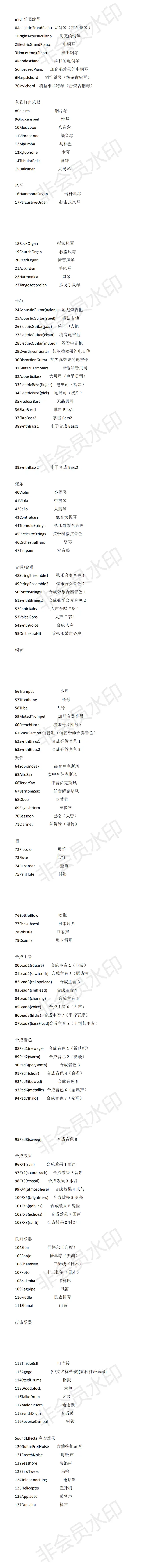 program参数指的是这个轨道的乐器,用数字命名不同的乐器。范围是0-127,下面是对应表。
