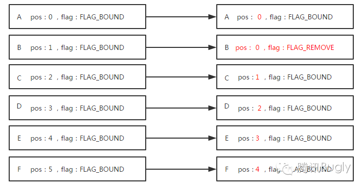 当调用notifyItemRemoved时,会对屏幕内ItemView做预处理,修改ItemView相应的pos以及flag(流程图中红色部分):