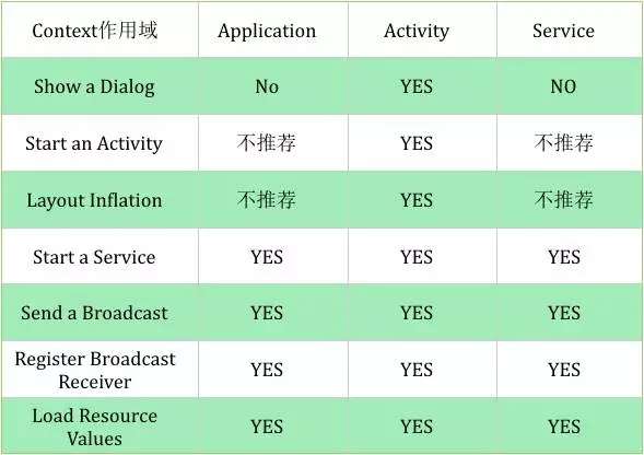 一句话总结:凡是跟UI相关的,都应该使用Activity做为Context来处理;其他的一些操作,Service,Activity,Application等实例都可以,当然了,注意Context引用的持有,防止内存泄漏。