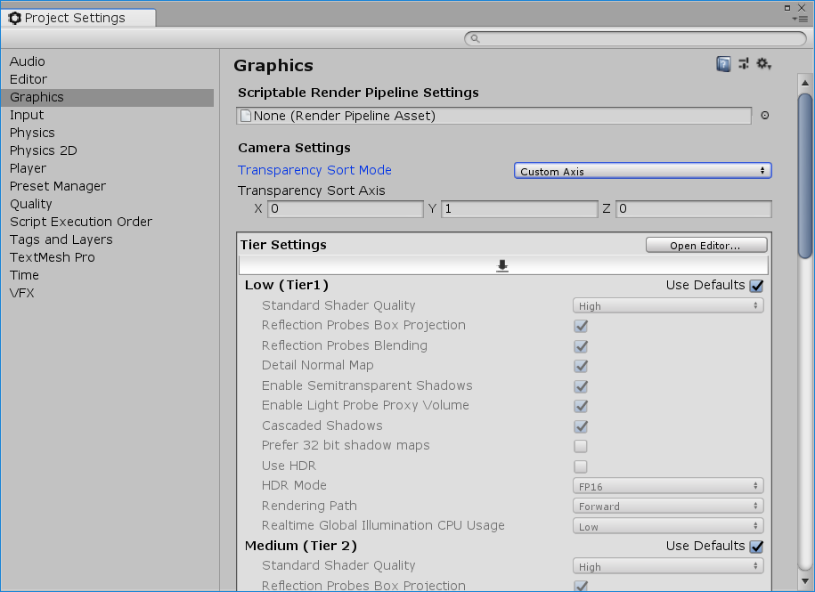 1.选择 Edit > Project Settings。 2. 在左侧类别菜单中,单击 Graphics。 3.在 Camera Settings 中,找到 Transparency Sort Mode 字段。此字段决定了精灵的绘制顺序。使用下拉菜单将此设置从 Default 更改为 Custom Axis。