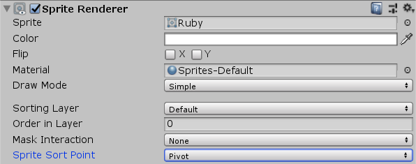 3. 找到 Sprite Sort Point 字段。目前,此字段设置为 Center,这意味着会使用精灵的中心点来决定这个游戏对象应该在另一个游戏对象的前面还是后面。 4.将 Sprite Sort Point 更改为 Pivot。