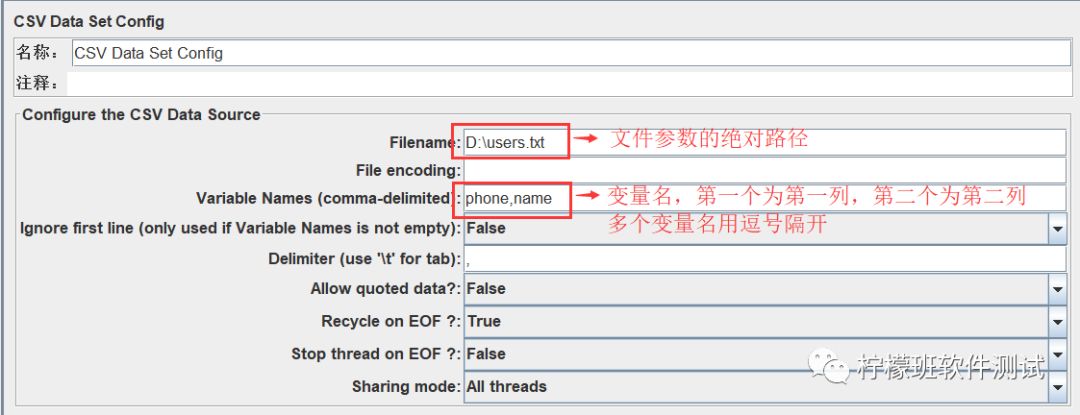 Sharing Mode:共享模式。All threads:所有线程,所有线程循环取值,线程1取第一行,线程2取下一行;Current thread group:当前线程组,各个线程组分别循环取值;Current thread:当前线程,该测试计划内的所有线程都取第一行。