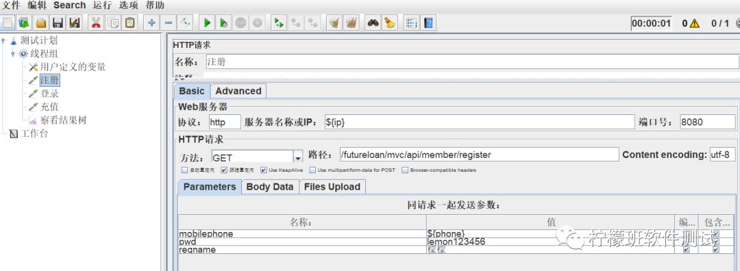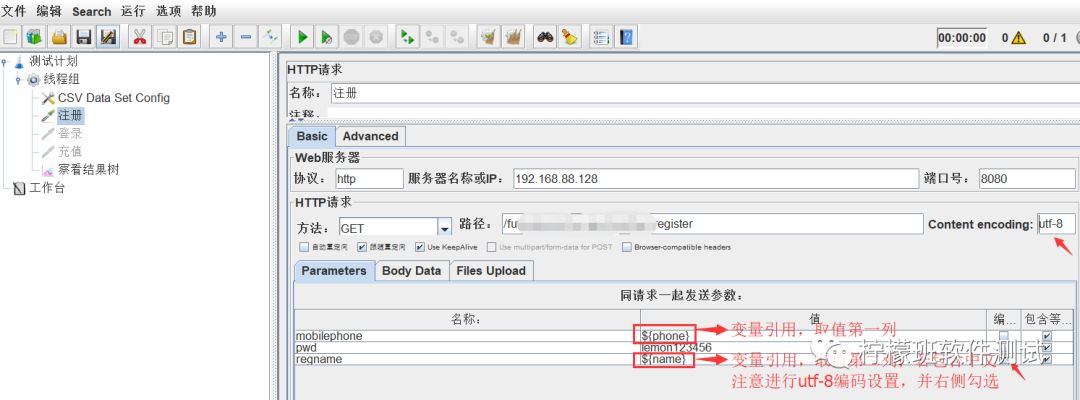 2)然后将设置后的变量名称,在注册、登录、充值请求中进行参数化引用${ip}、${phone}