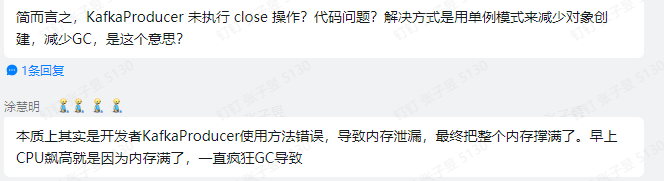 简单来说,不应该每次生产数据都去 new 一个 KafkaProducer ,使用一个 KafkaProducer 就可以,在使用一个的情况下,也不需要 close ;造成目前问题的情况是,每次都 new 了新的 KafkaProducer,且都没有 close,不过每次都 new KafkaProducer 本身就不合理