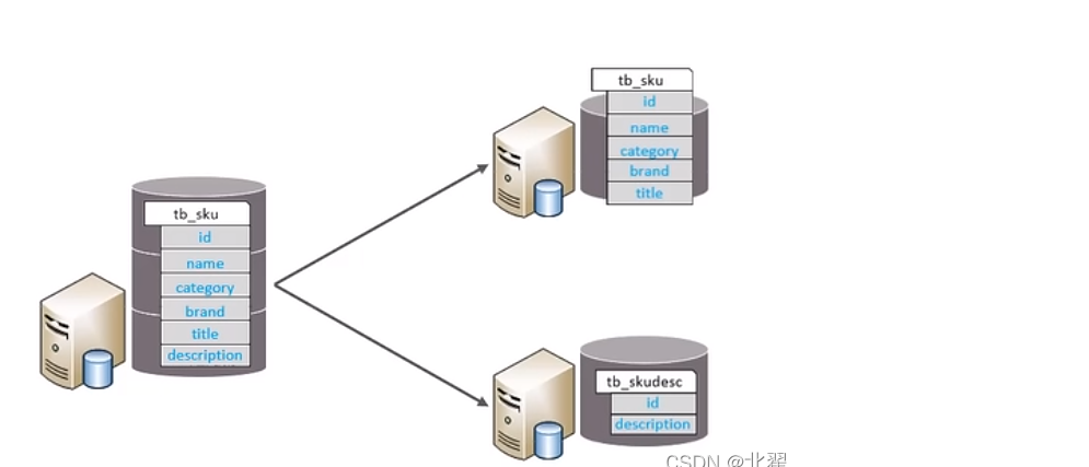 一般来说,某业务实体中的各个数据项的访问频率是不一样的,部分数据项可能是占用存储空间比较大的。例如商品描述。所以,当表数据量大时,可以将表按字段切开,将热门字段、冷门字段分别放一个表。