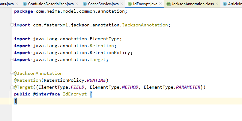 package com.heima.model.common.annotation; import com.fasterxml.jackson.annotation.JacksonAnnotation; import java.lang.annotation.ElementType; import java.lang.annotation.Retention; import java.lang.annotation.RetentionPolicy; import java.lang.annotation.Target; @JacksonAnnotation @Retention(RetentionPolicy.RUNTIME) @Target({ElementType.FIELD, ElementType.METHOD, ElementType.PARAMETER}) public @interface IdEncrypt { }