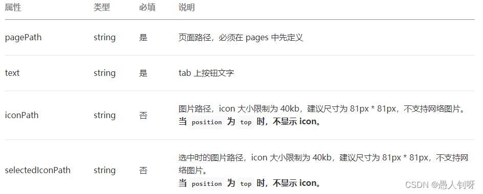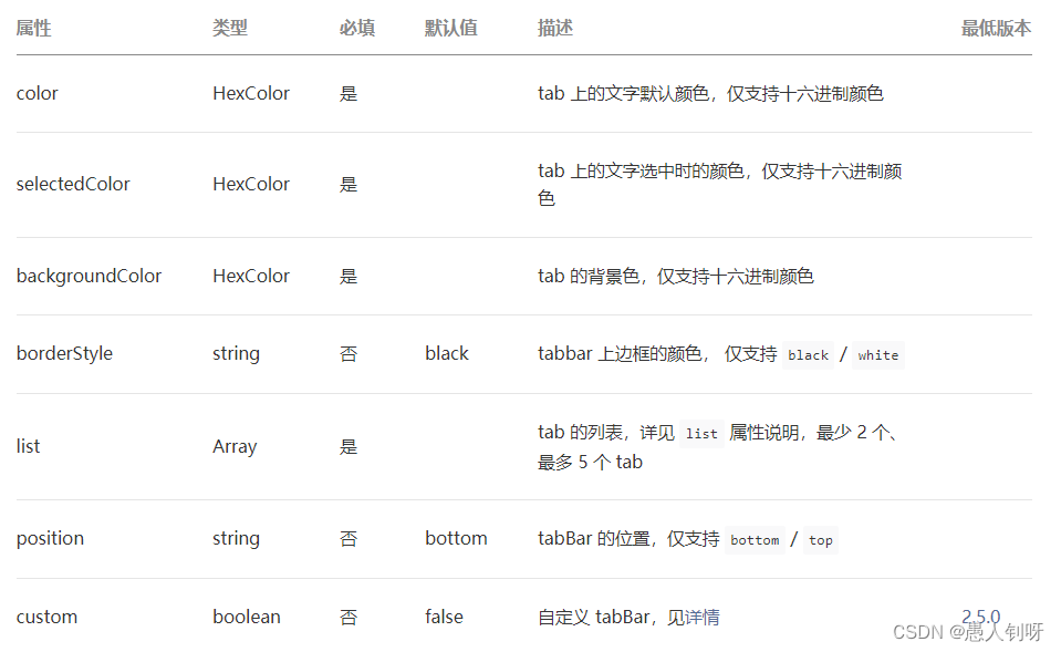 其中 list 接受一个数组,只能配置最少 2 个、最多 5 个 tab。tab 按数组的顺序排序,每个项都是一个对象,其属性值如下: