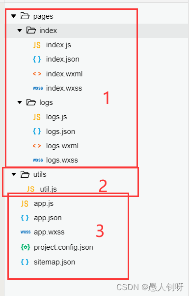 微信小程序目录结构可以分为3个部分:1框架页面文件,2工具类文件 ,3框架全局文件。