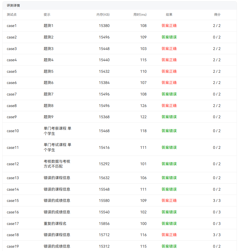 2)如果解析某个成绩信息时,输入的成绩数量和课程的考核方式不匹配,输出:学号+英文空格+姓名+英文空格+": access mode mismatch"