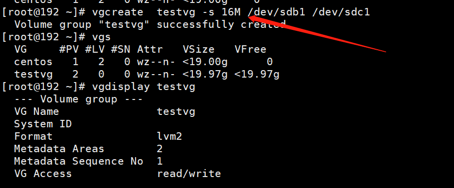 4、创建名为testvg的VG;要求PE大小 为16MB.
