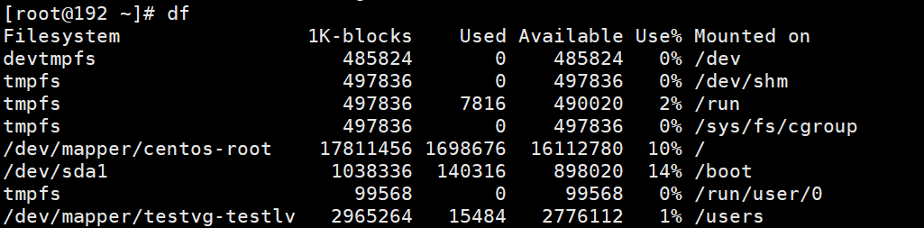 [root@192 ~]# mount /dev/testvg/testlv /users/ #挂载
