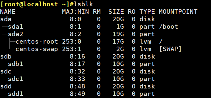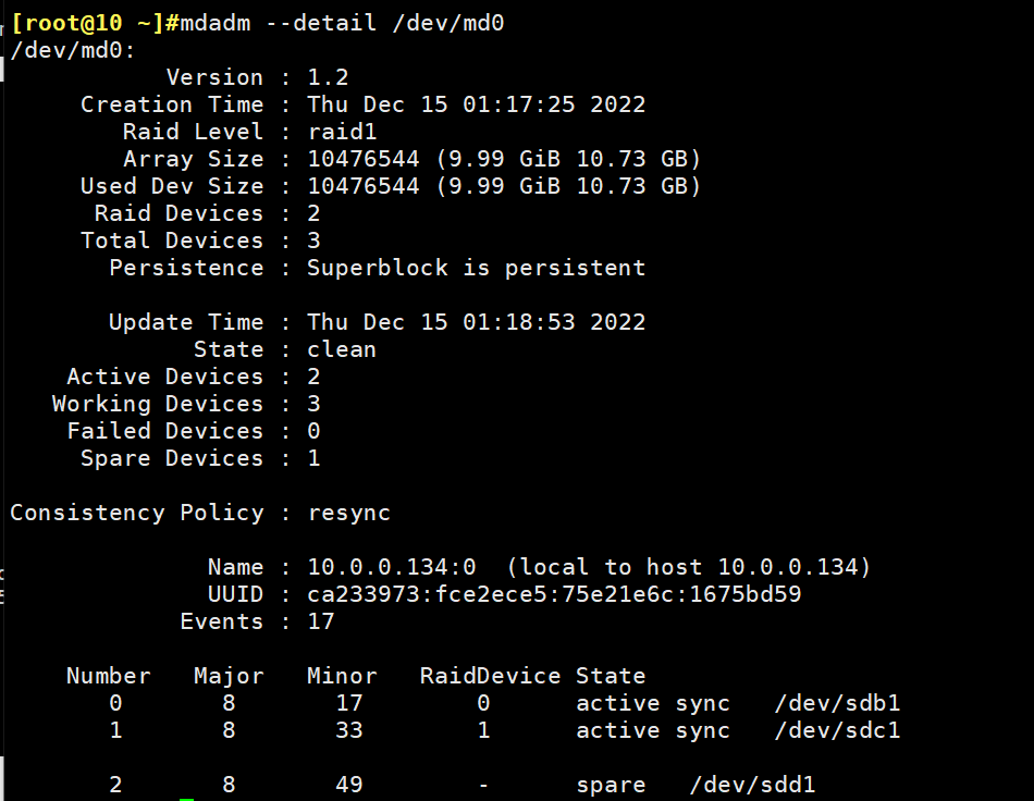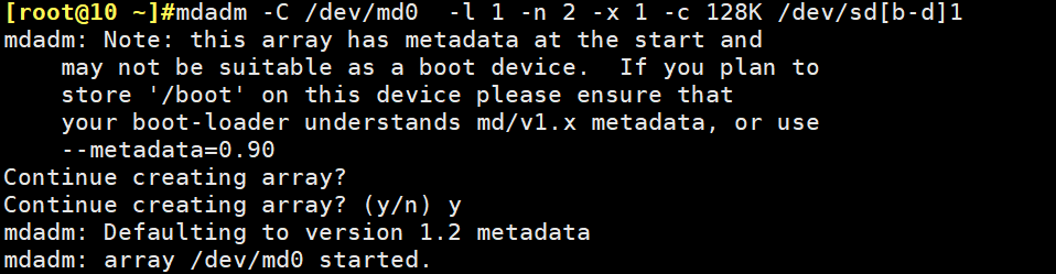[root@10 ~]#mdadm -C /dev/md0 -l 1 -n 2 -x 1 -c 128K /dev/sd[b-d]1 #创建RAID 1, -C创建,-l raid级别,-n磁盘数量,-x空闲磁盘数量,-c chunk大小。