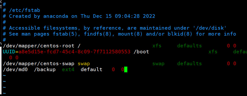 7. 创建10G的RAID1,要求CHUNK为128K,文件系统为ext4,有一个空闲盘,开机可自动挂载至/backup目录