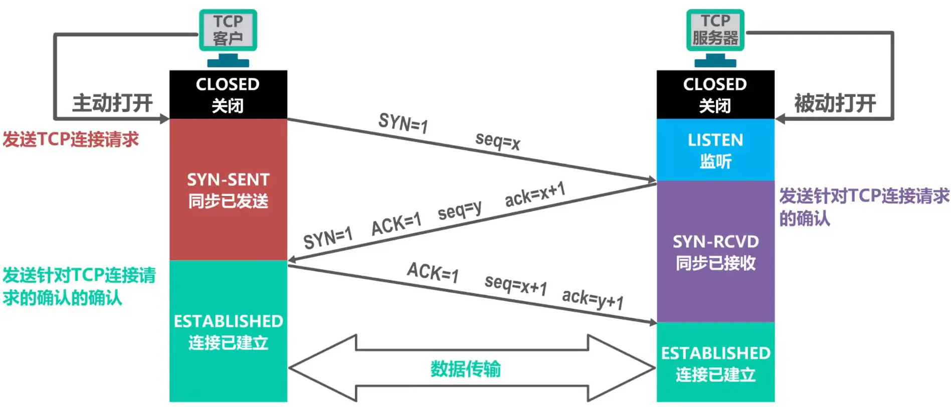 三次握手是 TCP 连接的建立过程。在握手之前,主动打开连接的客户端结束 CLOSE 阶段,被动打开的服务器也结束 CLOSE 阶段,并进入 LISTEN 阶段。随后进入三次握手阶段: