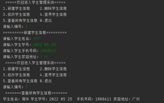 1 # 学生信息管理系统 —— 函数封装 2 3 """ 4 思考: 5 1、学生信息有哪些? 6 2、是否区分学生、老师、管理员权限 7 3、该怎么存储学生信息 8 4、是否需要登录界面 9 10 介绍: 11 在工作生活中,信息管理很常见、例如:文件归档、账户流水账、登录信息、宿舍管理、购票管理、学生信息管理等。 12 13 知识点: 14 1、自定义函数的使用:函数封装、调用,使用到了默认参数和关键字参数 15 2、字典的使用:增 删 改 查 遍历 16 3、循环语句:while、for 17 4、条件语句:if、elif、else 18 5、跳转语句:break、continue 19 6、字符串运算 20 7、旗帜应用,这个很重要 21 22 不足(待改善): 23 1、在打印学生信息使用到了制表符'\t',但打印出来的效果并不理想,有哪位高人可以指点一下 24 2、此程序无太强的可读性,后续可以完善,添加一些条件和提示语 25 3、字典的特点:无法存储两个姓名一样的学生,体现了字典的不可重复性 26 4、在新建学生信息时,如果出现重复新建,会覆盖原有的学生信息,等价于修改了学生信息,可以添加遍历判断 27 5、程序员的愤怒“删除库跑路”,在本程序没有体现,可以利用clear()函数实现 28 6、最大的通病:没有实际保存,退出程序即恢复出厂设置,有待改善 29 """ 30 31 32 # 定义一个空字典,用存储学生信息 # 字典的特点:元素不可重复、元素无序 33 stu_info = dict() 34 message = '请输入编号:' 35 36 37 # 函数封装 ========================================================== 38 # 菜单打印 39 def menu(): 40 print(' ' + '='*5 + '欢迎进入学生管理系统' + '='*5) 41 print('1.新建学生信息\t2.删除学生信息') 42 print('3.修改学生信息\t4.查寻学生信息') 43 print('5.查看所有学生信息\t0.退出') 44 45 46 # 打印标题 ========================================================== 47 def show_title(num1=0, info='='*10, num=9): 48 print(' '*num1 + '=' * num + info + '=' * num) 49 50 51 # 输入编号(选择菜单) ============================================== 52 def input_num(message): 53 return input(message) 54 55 56 # 1.新建学生信息 ==================================================== 57 def new_stu_info(): 58 show_title(info='新建学生信息') # 打印标题 59 60 # 输入学生信息 61 name = input('请输入学生姓名:') 62 stu_id = input('请输入学生学号:') 63 phone_num = input('请输入学生手机号码:') 64 addr = input('请输入学生家庭地址:') 65 66 # 存储学生信息(添加到字典中) 67 stu_info[name] = [stu_id, phone_num, addr] 68 # student_info.update(name=[stu_id, phone_num, addr]) # 注意:这里字典添加元素不能用update() 69 70 71 # 2.删除学生信息 ==================================================== 72 def del_stu_info(): 73 show_title(info='删除学生信息') # 打印标题 74 75 # 判断字典是否为空 76 if stu_info == dict(): 77 show_title(info='暂无学生信息') # 打印提示 78 return 79 80 # 输入需要删除的学生姓名 81 name = input('请输入需要删除的学生姓名:') 82 flag_del = 0 # 定义删除的旗帜 83 84 # 在字典中查找是否存在 85 for i in stu_info: 86 if name == i: 87 print('学生姓名:{}\t学号:{}\t手机号码:{}\t家庭地址:{}'.format(name, stu_info[i][0], stu_info[i][1], stu_info[i][2])) 88 89 stu_info.pop(name) # 删除字典元素 90 show_title(info='已删除成功', num1=1) # 打印删除成功 91 flag_del = 1 # 删除旗帜赋值 92 break 93 94 # 判断是否删除此学生信息 95 if flag_del != 1: 96 show_title(info='无此学生信息') # 打印提示 97 98 99 # 3.修改学生信息 ==================================================== 100 def change_stu_info(): 101 show_title(info='修改学生信息') # 打印标题 102 103 # 判断字典是否为空 104 if stu_info == dict(): 105 show_title(info='暂无学生信息') # 打印提示 106 return 107 108 # 输入需要修改的学生姓名 109 name = input('请输入需要修改的学生姓名:') 110 flag_change = 0 # 定义修改的旗帜 111 112 # 在字典中查找是否存在 113 for i in stu_info: 114 if name == i: 115 116 # 输入学生新的信息 117 new_name = input('请输入学生新的姓名:') 118 new_stu_id = input('请输入学生学号:') 119 new_phone_num = input('请输入学生手机号码:') 120 new_addr = input('请输入学生家庭地址:') 121 122 # 判断是否需要删除原来的元素 123 if new_name != name: 124 stu_info.pop(name) # 删除原来的元素 125 126 # 存储修改后学生信息 127 stu_info[new_name] = [new_stu_id, new_phone_num, new_addr] 128 129 print('学生姓名:{}\t学号:{}\t手机号码:{}\t家庭地址:{}'.format(new_name, new_stu_id, new_phone_num, new_addr)) 130 show_title(info='已修改成功', num1=1) # 打印已修改成功 131 132 flag_change = 1 # 修改旗帜赋值 133 break 134 135 # 判断是否修改此学生信息 136 if flag_change != 1: 137 show_title(info='无此学生信息') # 打印提示 138 139 140 # 4.查寻学生信息 ==================================================== 141 def find_stu_info(): 142 show_title(info='查寻学生信息') # 打印标题 143 144 # 判断字典是否为空 145 if stu_info == dict(): 146 show_title(info='暂无学生信息') # 打印提示 147 return 148 149 # 输入需要查询的学生姓名 150 name = input('请输入需要查询的学生姓名:') 151 flag_find = 0 # 定义查询的旗帜 152 153 # 在字典中查找是否存在 154 for i in stu_info: 155 if name == i: 156 print('学生姓名:{}\t学号:{}\t手机号码:{}\t家庭地址:{}'.format(name, stu_info[i][0], stu_info[i][1], stu_info[i][2])) 157 158 flag_find = 1 # 查询旗帜赋值 159 break 160 161 # 判断是否查询到此学生信息 162 if flag_find != 1: 163 show_title(info='无此学生信息') # 打印提示 164 165 166 # 5.查看所有学生信息 ====================================