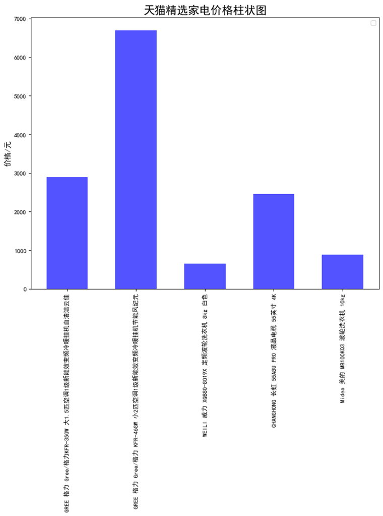 1 x = 天猫精选['name'] 2 y = 天猫精选['price'] 3 fig = plt.figure(figsize=(10, 8), dpi=80) 4 plt.rcParams['font.sans-serif']=['SimHei'] #用来正常显示中文标签 5 plt.rcParams['axes.unicode_minus']=False 6 plt.xticks(rotation=90) 7 plt.bar(x,y,alpha=0.2, width=0.6, color='b', lw=3) 8 plt.legend(loc = "best")#图例 9 plt.title("天猫精选家电价格柱状图",fontsize=18) 10 plt.ylabel("价格/元",fontsize=12)#纵坐标名字 11 plt.show()
