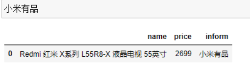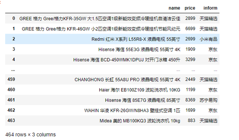 1 # 进行分类 2 京东 = pd.DataFrame(columns=['name','price', 'inform']) 3 小米有品 = pd.DataFrame(columns=['name','price', 'inform']) 4 天猫精选 = pd.DataFrame(columns=['name','price', 'inform']) 5 顺电网上商城 = pd.DataFrame(columns=['name','price', 'inform']) 6 苏宁易购 = pd.DataFrame(columns=['name','price', 'inform']) 7 for i in Jiadian['inform']: 8 if "京东" in i: 9 a = Jiadian[(Jiadian.inform==i)].index.tolist() 10 京东=京东.append(Jiadian.loc[a,:],ignore_index=True) 11 elif "小米有品" in i: 12 n = Jiadian[(Jiadian.inform==i)].index.tolist() 13 小米有品=小米有品.append(Jiadian.loc[n,:],ignore_index=True) 14 elif "天猫精选" in i: 15 n = Jiadian[(Jiadian.inform==i)].index.tolist() 16 天猫精选=天猫精选.append(Jiadian.loc[n,:],ignore_index=True) 17 elif "顺电网上商城" in i: 18 n = Jiadian[(Jiadian.inform==i)].index.tolist() 19 顺电网上商城=顺电网上商城.append(Jiadian.loc[n,:],ignore_index=True) 20 elif "苏宁易购" in i: 21 n = Jiadian[(Jiadian.inform==i)].index.tolist() 22 苏宁易购=苏宁易购.append(Jiadian.loc[n,:],ignore_index=True)