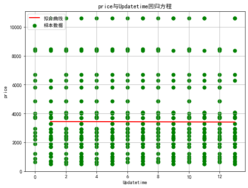 1 import seaborn as sns 2 import matplotlib.pyplot as plt 3 import numpy as mp 4 from scipy.optimize import leastsq 5 plt.rcParams['font.sans-serif'] = ['SimHei']#解决乱码问题 6 #定义变量 7 gsgm=qcwy.loc[:,'Updatetime'] 8 zprs=qcwy.loc[:,'price'] 9 #函数表达式 10 def func(params,x): 11 a,b,c=params 12 return a*x*x+b*x+c 13 def error_func(params,x,y): 14 return func(params,x)-y 15 P0=[1,9.0] 16 def main(): 17 plt.figure(figsize=(8,6)) 18 P0=[1,9.0,1] 19 Para=leastsq(error_func,P0,args=(gsgm,zprs)) 20 a,b,c=Para[0] 21 print("a=",a, "b=",b, "c=",c) 22 #绘图 23 plt.scatter(gsgm,zprs,color="green",label="样本数据",linewidth=2) 24 x=mp.linspace(13,1,2) 25 y=a*x*x+b*x+c 26 #右上角标 27 plt.plot(x,y,color="red",label="拟合曲线",linewidth=2) 28 #x,y轴名称 29 plt.xlabel('Updatetime') 30 plt.ylabel('price') 31 #标题 32 plt.title("price与Updatetime回归方程") 33 plt.grid() 34 plt.legend() 35 plt.show() 36 main()