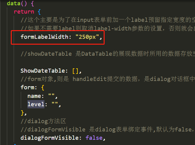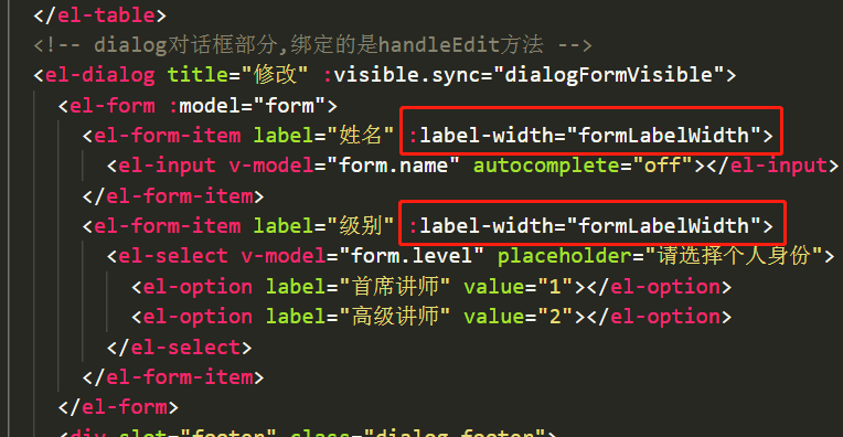 那么接下来就进入整体,首先我们要在单个表格中,植入一个模板,也就是上面的template。而template中则有两个tag标签,在标签里写入V-if语法进行判断,scope.row.level == 1 那么名称更换为"首席讲师" 相反则变为高级讲师