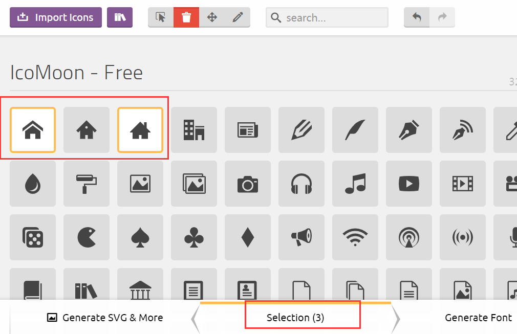 首先去:https://icomoon.io/app/#/select 选择相适应的图标