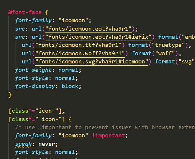 最後にspanにクラスセレクタを定義し、icomoonのフォントスタイル「font-family」を導入する。