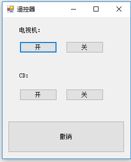 public partial class Form1 : Form { RemoteControl c; OnWatchTVCommand onWatchCommand; OffWatchTVCommand offWatchCommand ; OnCDCommand onCDCommnand; OFFCDCommand offCDCommand; public Form1() { InitializeComponent(); c = new RemoteControl(); WatchTV watchTv = new WatchTV(); onWatchCommand = new OnWatchTVCommand(watchTv); offWatchCommand = new OffWatchTVCommand(watchTv); CD cd = new CD(); onCDCommnand = new OnCDCommand(cd); offCDCommand = new OFFCDCommand(cd); c.SetCommand(0, onWatchCommand, offWatchCommand); c.SetCommand(1, onCDCommnand, offCDCommand); } RemoteControl remoteControl = new RemoteControl(); private void button1_Click(object sender, EventArgs e) { c.OnButtonWasPushed(0); } private void button2_Click(object sender, EventArgs e) { c.OFFButtonWasPushed(0); } private void button5_Click(object sender, EventArgs e) { c.Cancle(); } private void button4_Click(object sender, EventArgs e) { c.OnButtonWasPushed(1); } private void button3_Click(object sender, EventArgs e) { c.OFFButtonWasPushed(1); } }
