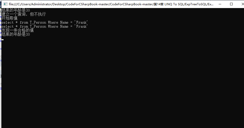 class Program { static void Main(string[] args) { using (var db = new DbHelper()) { db.Connect(); db.ExecuteSql("DELETE FROM T_Person"); //主键自增 db.ExecuteSql("INSERT INTO T_Person VALUES ('Frank',30,'M')"); db.ExecuteSql("INSERT INTO T_Person VALUES ('Mary',99,'F')"); //使用ADO.NET获得数据 var person = db.GetPerson("select * from T_Person where Name = 'Frank'"); foreach (var person1 in person) { Console.WriteLine("结果的年龄是" + person1.Age); } } //自己的逻辑 var myqueryable = new MyIQueryable<T_Person>(); //这里传入什么都没区别,反正里面是硬编码的 var ret = myqueryable.Where(m => m.Name == "Frank"); foreach (var person1 in ret) { Console.WriteLine("结果的年龄是" + person1.Age); } var seq = Enumerable.Range(0, 10); var a = seq.First(); var b = seq.Select(s => s / 2 == 0); Console.ReadKey(); } }